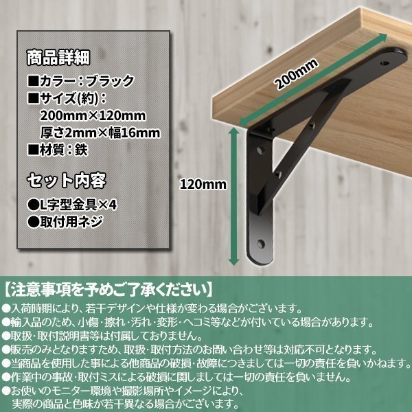 棚受け 金具 L字型 棚づくり 棚 アイアンブラケット 4本 セット 20cm ブラケット DIY 収納 200×120×16 ディスプレイ 棚作り