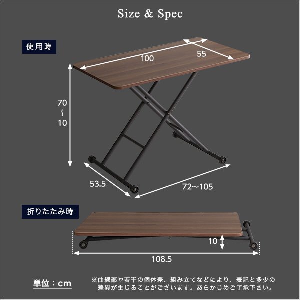 | 【ポイント】 スタイルに合わせて調節可能な昇降テーブルです。 コンパクトに収納可能な折りたたみ式で収納場所に困りません。 天板は幅100cmで広く使用可能でデスクワークにも最適です。 |