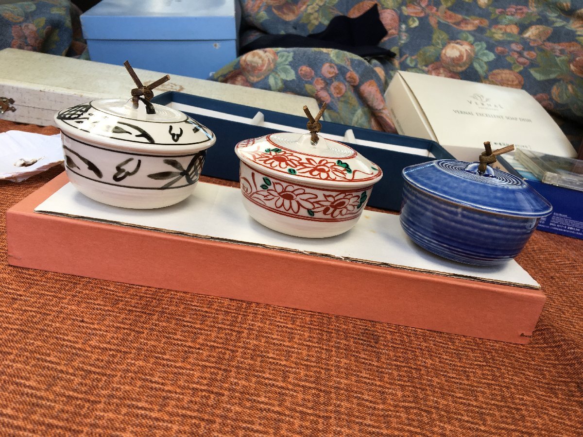 こんなん出ましたけど。創作陶器京都たち吉蓋付茶碗3点3種でございます。自宅