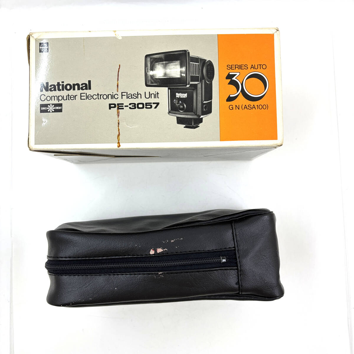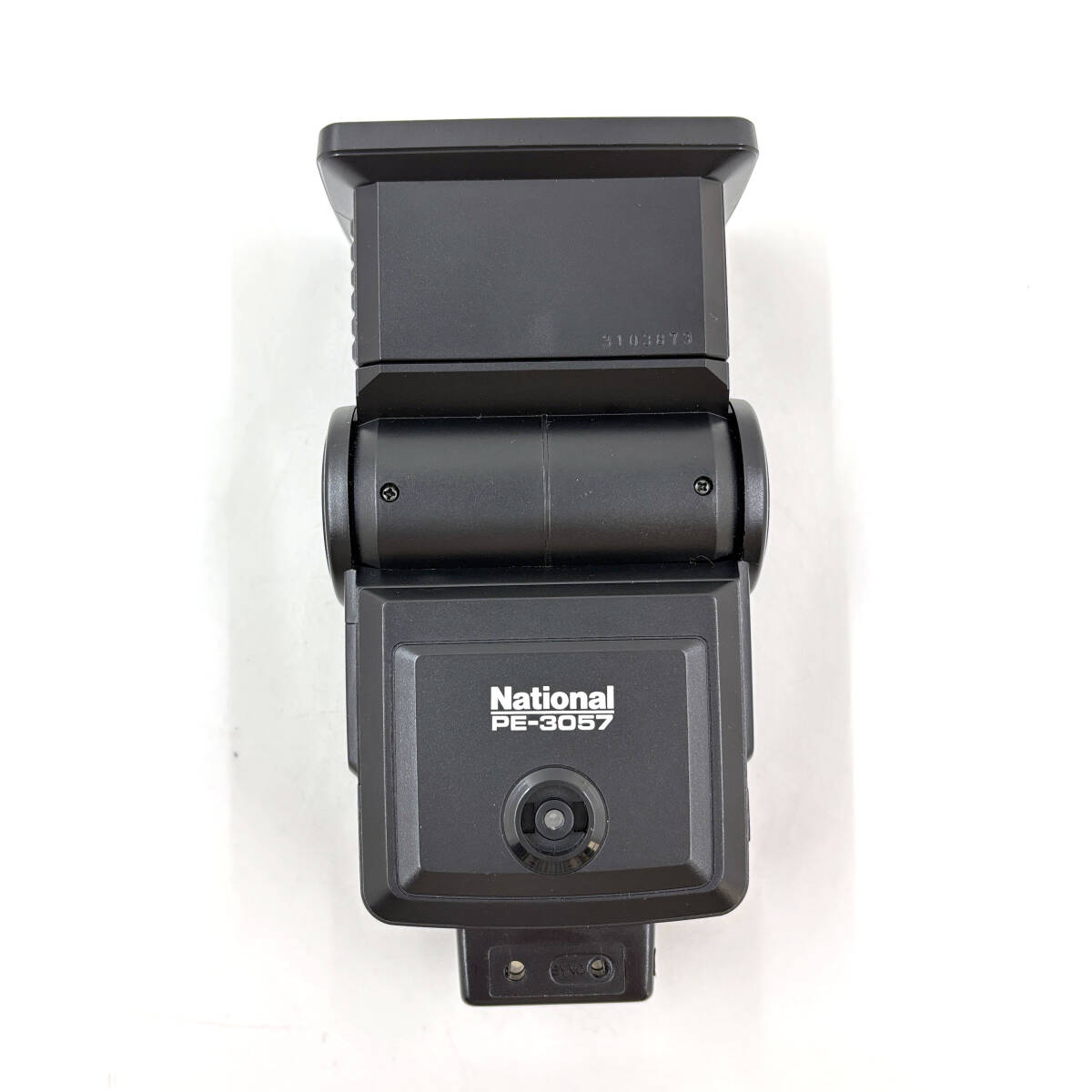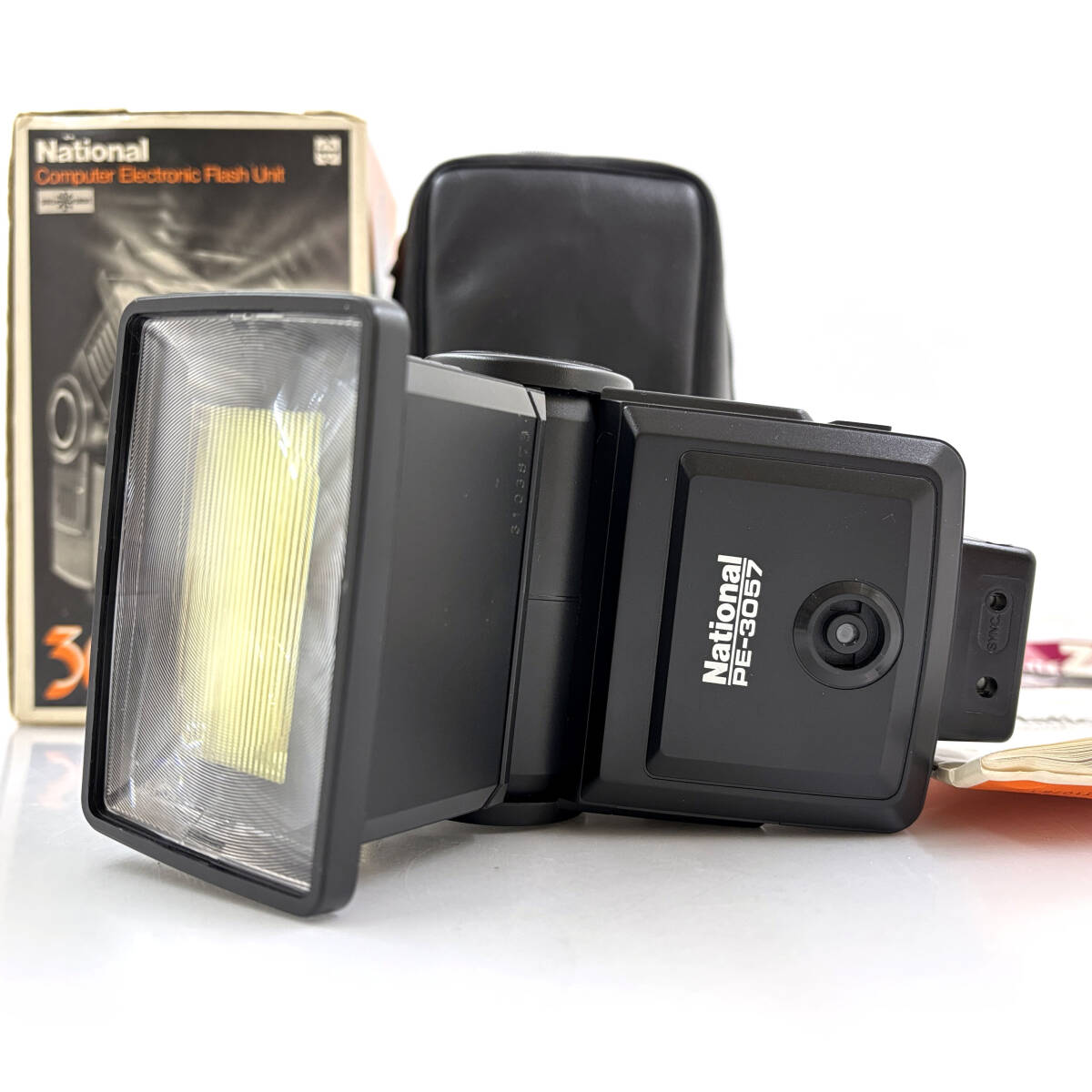 National PE-3057は、オート機能を備えたストロボユニットで、当時の一眼レフやレンジファインダーカメラで広く使用されました。堅牢な作りと安定した発光性能が特徴です。