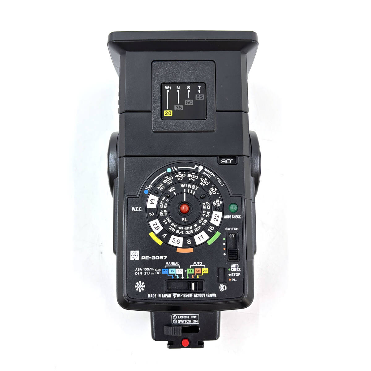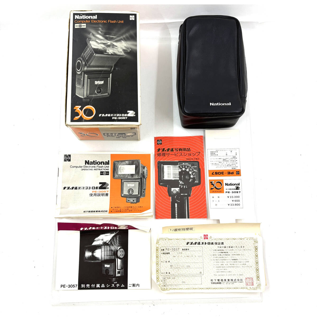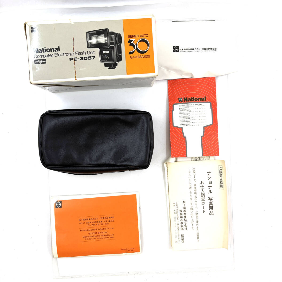 National PE-3057は、オート機能を備えたストロボユニットで、当時の一眼レフやレンジファインダーカメラで広く使用されました。堅牢な作りと安定した発光性能が特徴です。