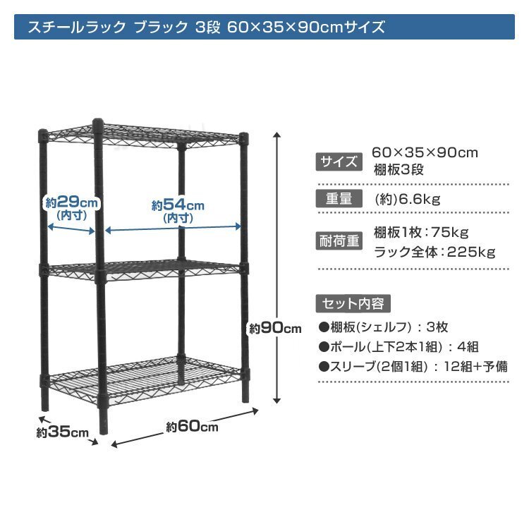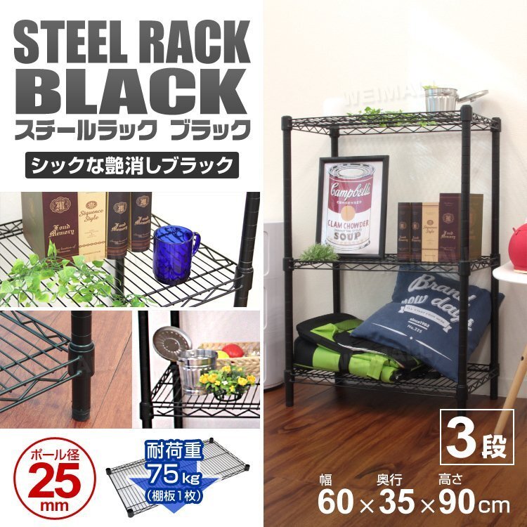 | どんなお部屋にも合わせやすいスチールラックです。 ぐらつき防止アジャスター付き! クギやネジを使わずに簡単に組み立て出来ます! 棚の高さを自由に変えることができます。 一人暮らしのお部屋やリビング、キッチン、物置など場所を問わず活躍できます。 錆に強いパウダーコーティングで水回りでの使用も◎ アパレルショップの店頭用やオフィスにも使用されています。 【仕様】 サイズ(約):幅60×奥行35×高さ90cm 耐荷重(約):(全体)225kg / (棚板1枚あたり)75kg 材質:スチール(クロームメッキ)、ABS樹脂他 重量(約):6.6kg カラー:ブラック 【商品内容】 シェルフ(棚板) ×3 ポール(上下2本1組) ×4 スリーブ(2個1組) ×12(+予備付属) 【もちろん新品未使用品です】 |