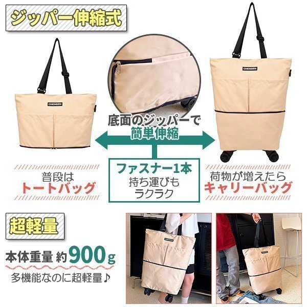 折りたたみ ショッピングカート 2way 2段階仕様 キャスター付 トートバッグ 防水 買い物 エコバッグ 二段ジッパー キャリーバッグ