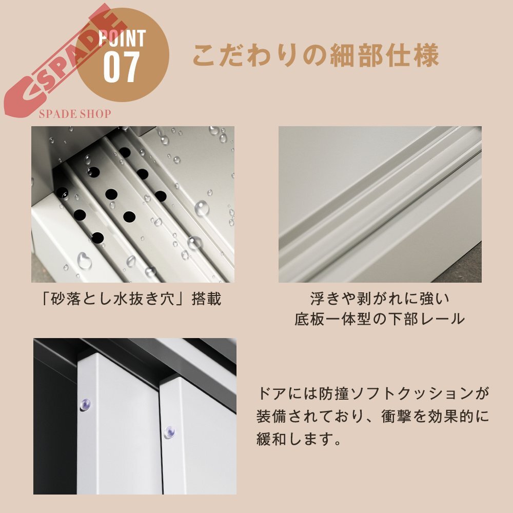 • 【こだわりの細部仕様】「砂落とし水抜き穴」搭載 浮きや剥がれに強い底板一体型の下部レール ドアには防撞ソフトクッションが装備されており、衝撃を効果的に緩和します。