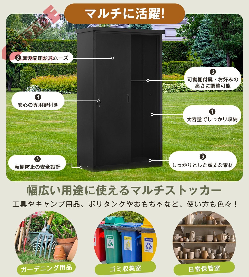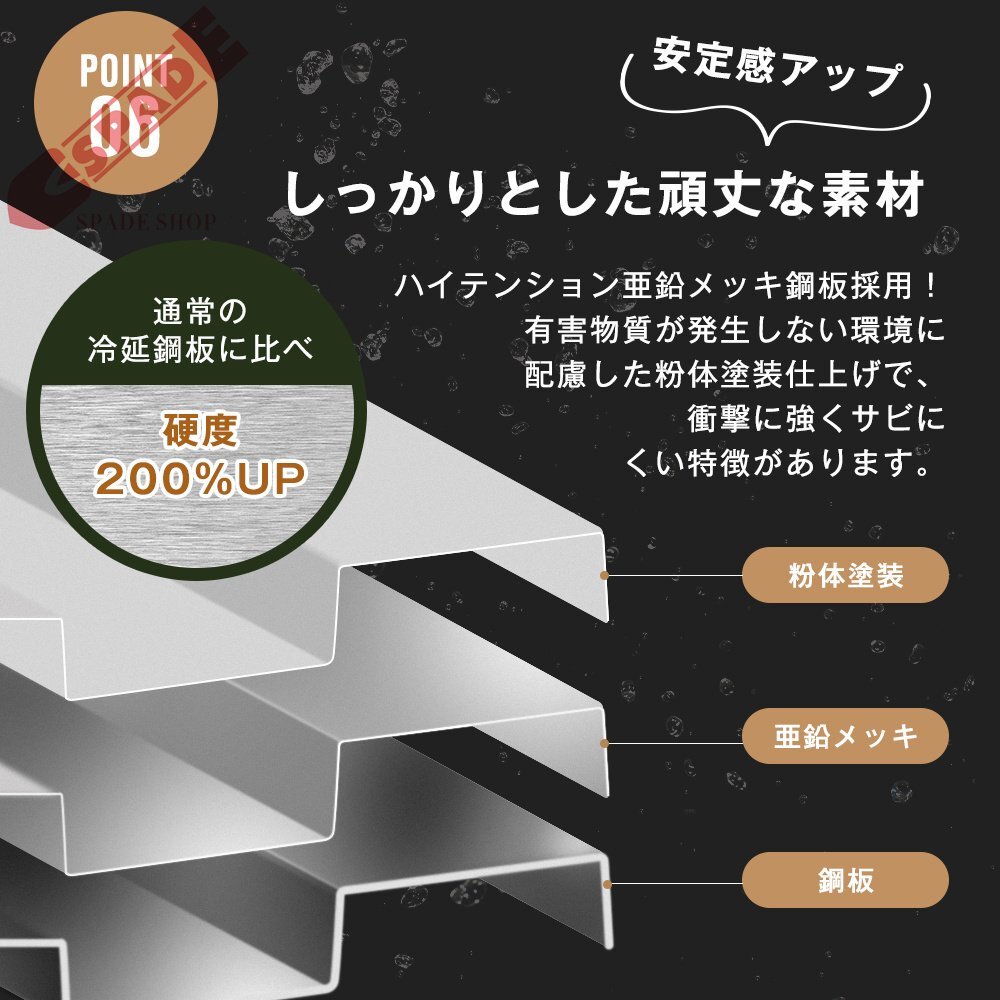 • 【しっかりとした頑丈な素材】ハイテンション亜鉛メッキ鋼板採用!有害物質が発生しない環境に配慮した粉体塗装仕上げで、衝撃に強くサビにくい特徴があります。通常の冷延鋼板に比べ硬度200%UP。外部には特別な防水加工が施され、製品全体が防水・防錆効果が優れています。ご注意:完全な防水仕様ではありませんので、事前に防水処理を行うことをお勧めします。