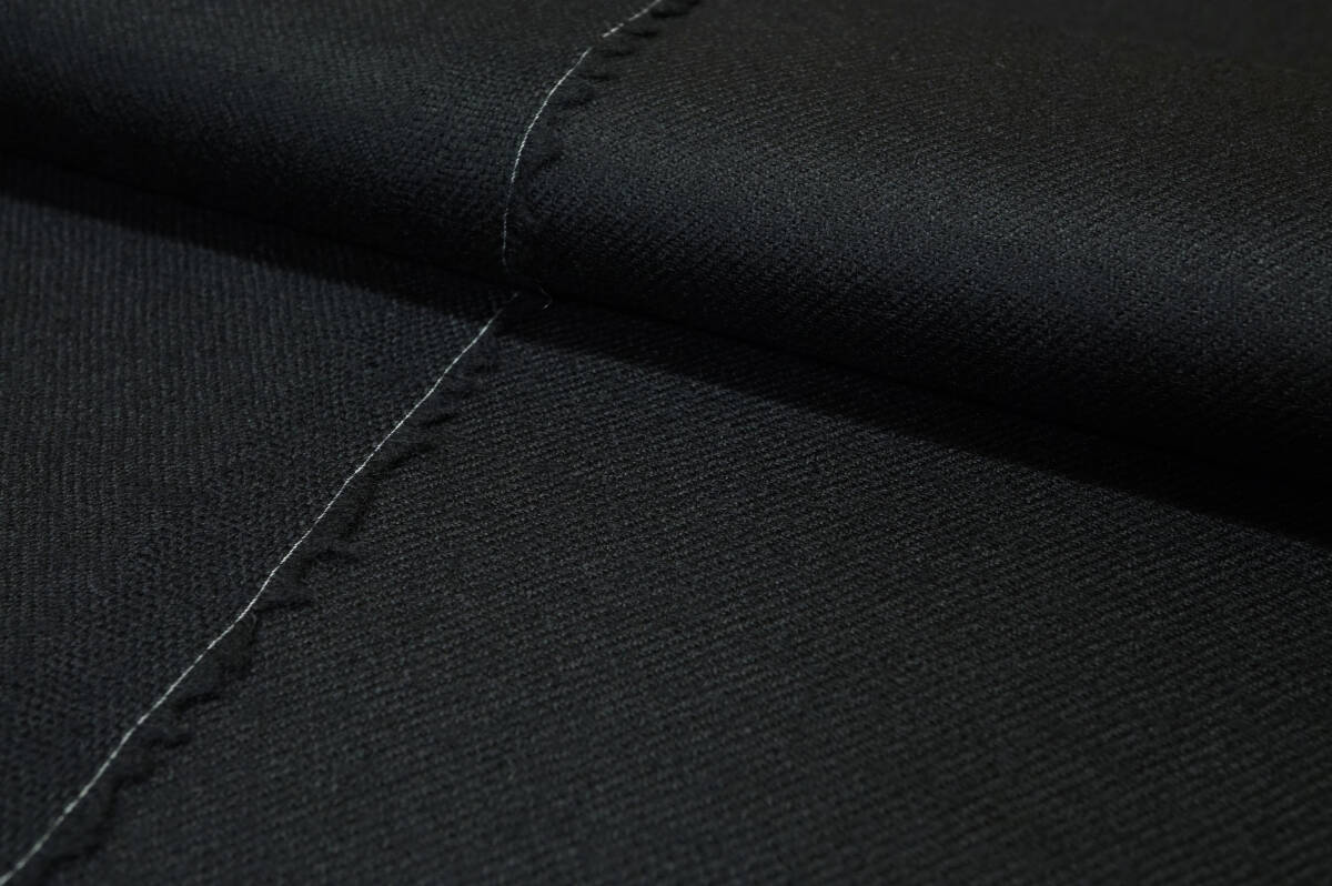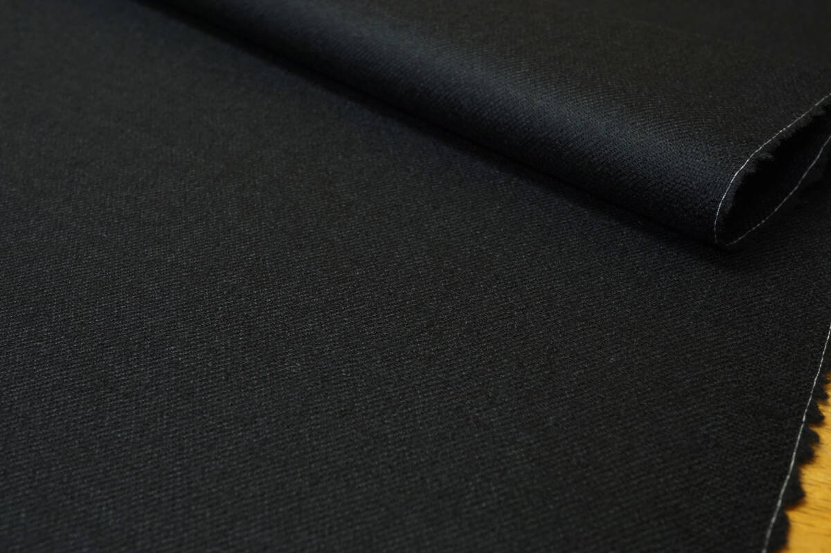 ウール・ポリエステル混、厚さは中厚程度、軽めの毛羽感を感じるしっとり柔らかな風合いで、チクチク感・硬質感・伸縮性はございません。