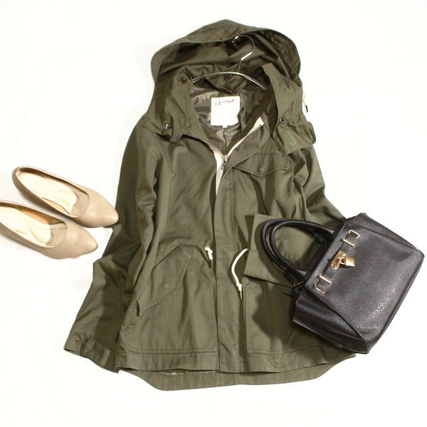 取り外しできるフードが付いたジップアップのミリタリーコートです。