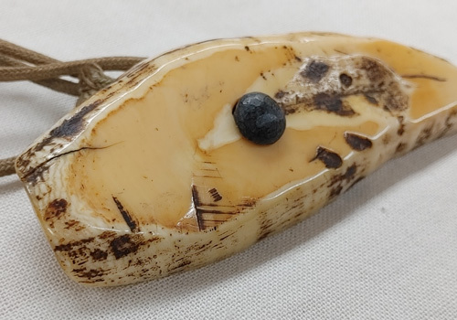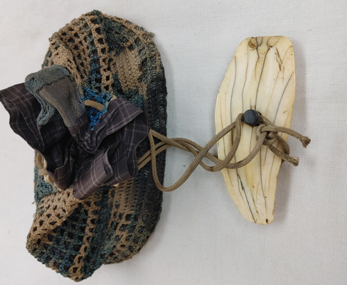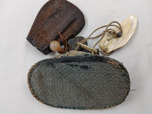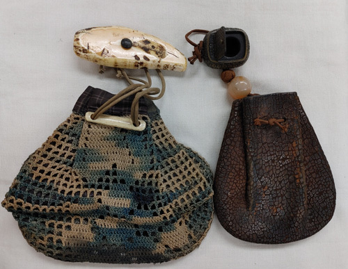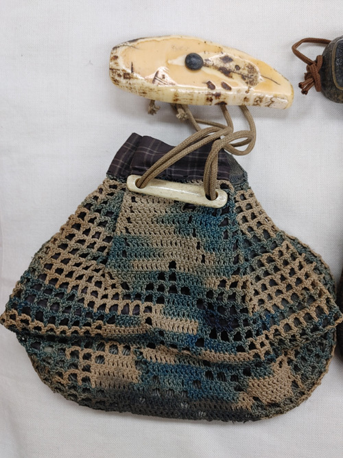 獣牙根付と織りの巾着袋1点