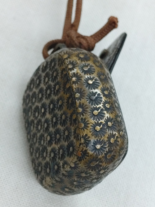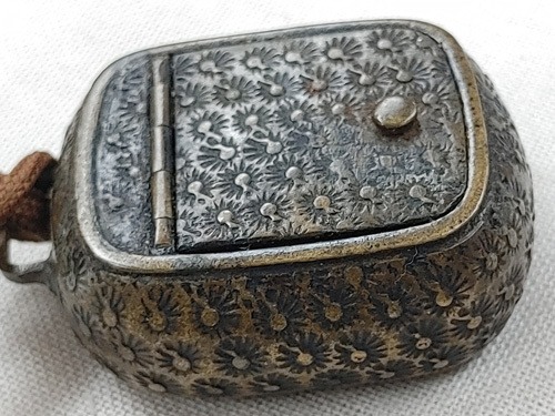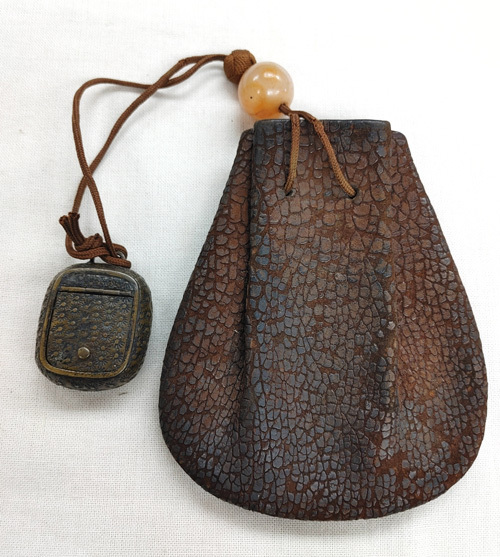 鋳銅矢立墨壺と皮の巾着袋1点の計2点です。