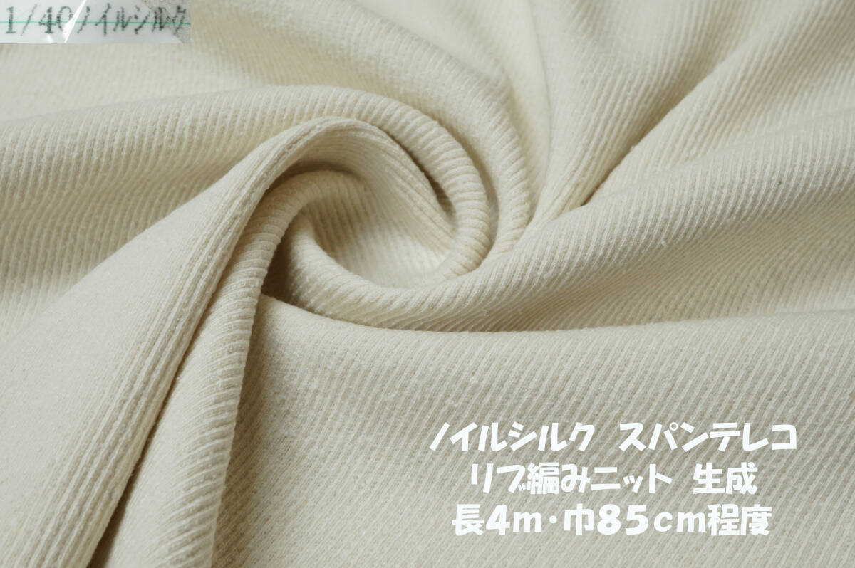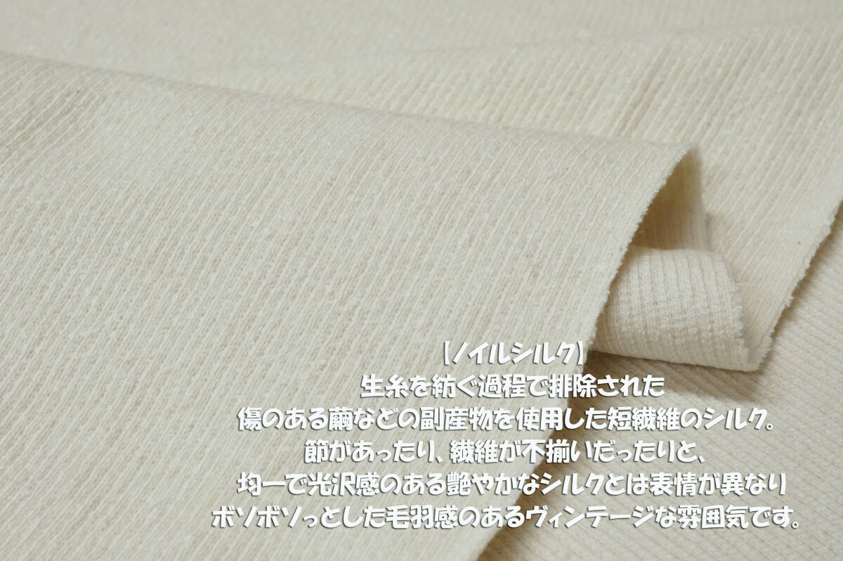 絹紡糸をつくる際にできる、ノイルとよばれるシルクのくずを原料にして紡績した糸のノイルシルク スパンテレコ(リブ編み)ニット生地の出品でございます。