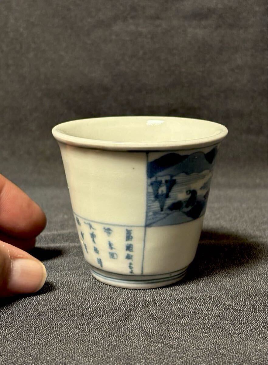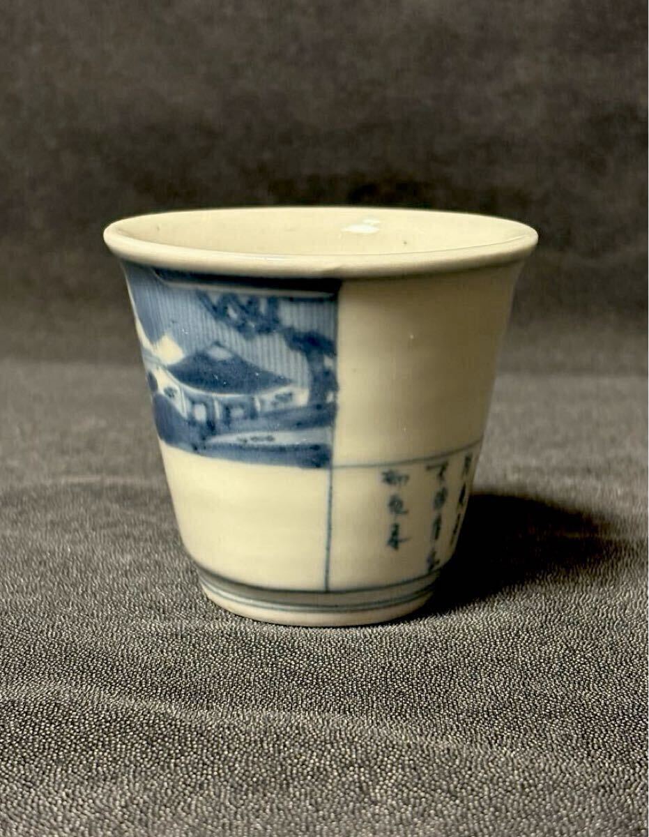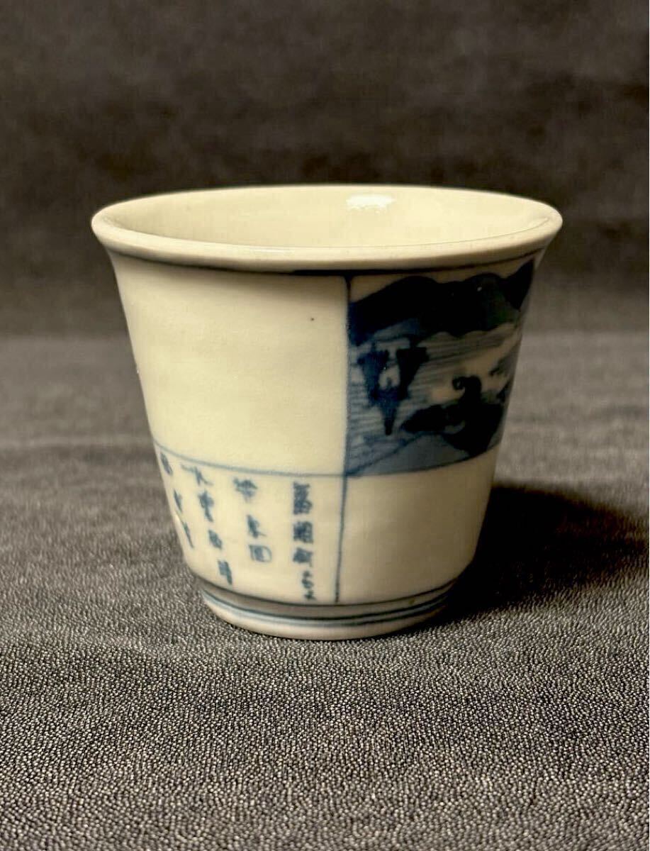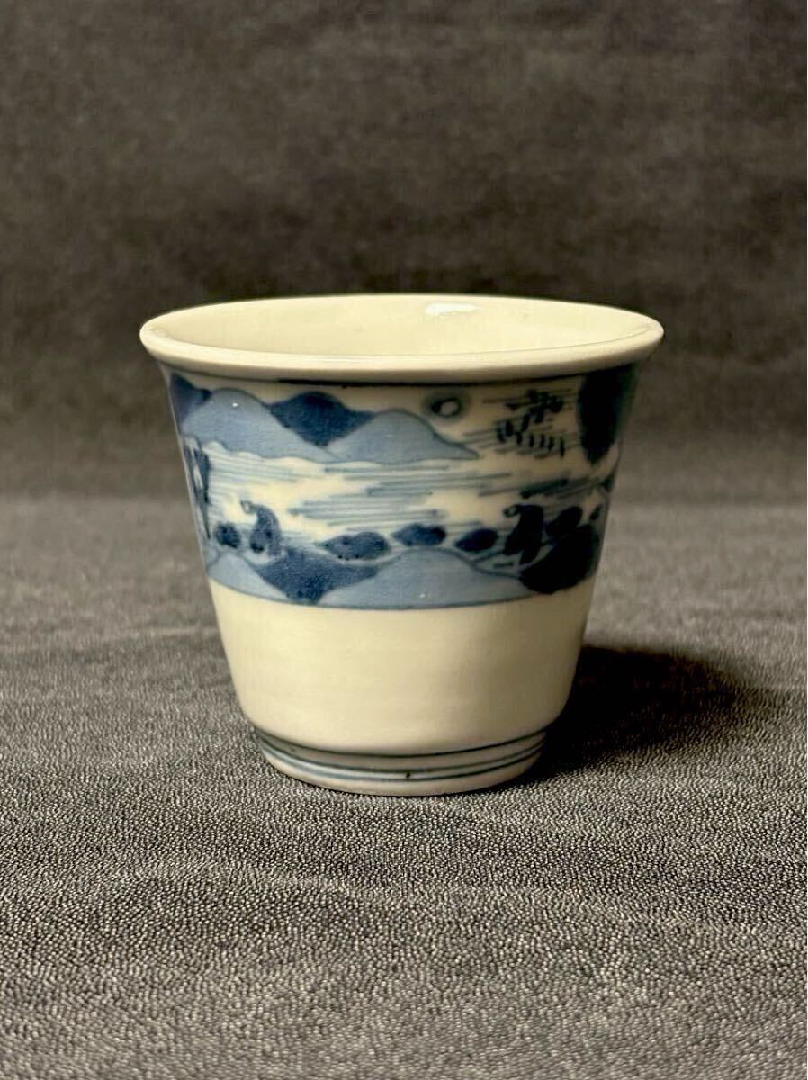 垢抜けたデザインの古伊万里筒型です。山水画と漢詩が片身変わりで描かれた非常に珍しい絵付けです。余白を十分にとったもので非常にモダンな印象、盛期伊万里の逸品です。状態はうれしい無疵完品。サイズは高さ6、口径6.8、高台3.9センチくらいです。この機会にいかがでしょうか。当方酒器を中心に出品しております。よろしければ出品者の他の出品もご覧ください。発送はヤマト便で行わせていただきます。送料は一律800円(沖縄1500円、北海道は1200円、離島は1800円)です。ご不明な点はご質問欄よりお気軽にお問い合わせください。