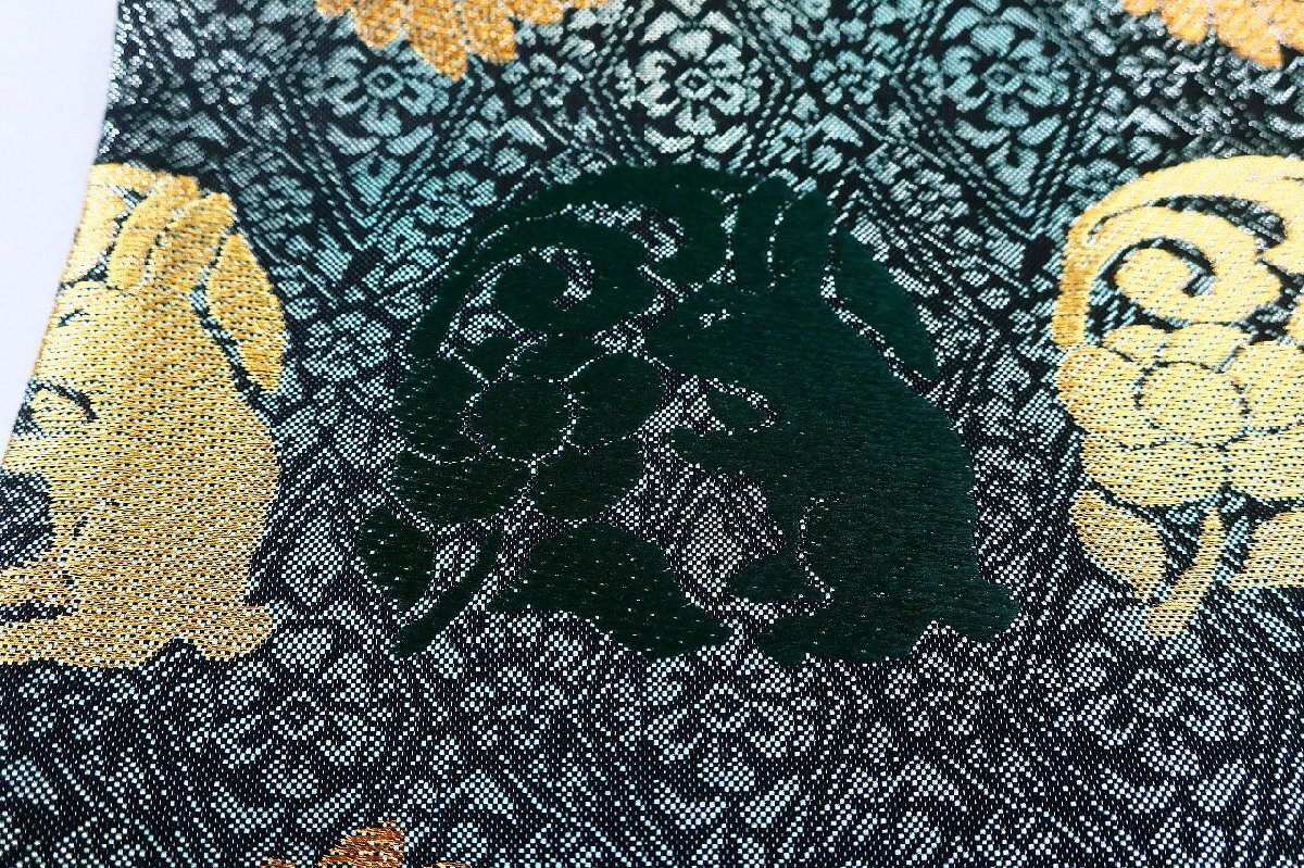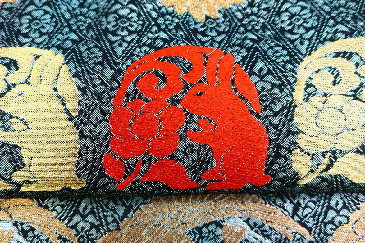 グレー系地に花うさぎに飛び鶴が織り込まれた袋帯です。 所々色違いの糸で織られた花うさぎが目を引く、お洒落な一本です。 担当:前田 |