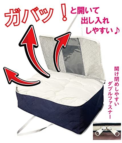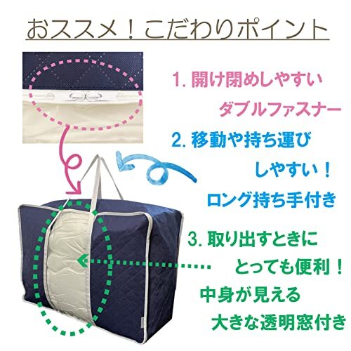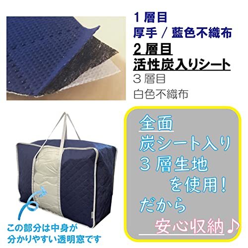 かさばる羽毛布団をスッキリ収納!通気性に優れた厚手の不織布(ふしょくふ)素材に活性炭シートを加工。収納袋の全面に活性炭シート入りの三層生地(一部クリア窓)を使用しているので安心して次のシーズンまで保管できます。大きく開くファスナーで出し入れしやすく、持ち運びや整理に便利なロング持ち手付きです。