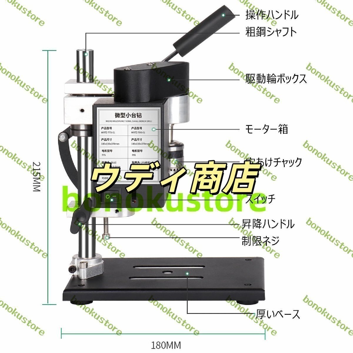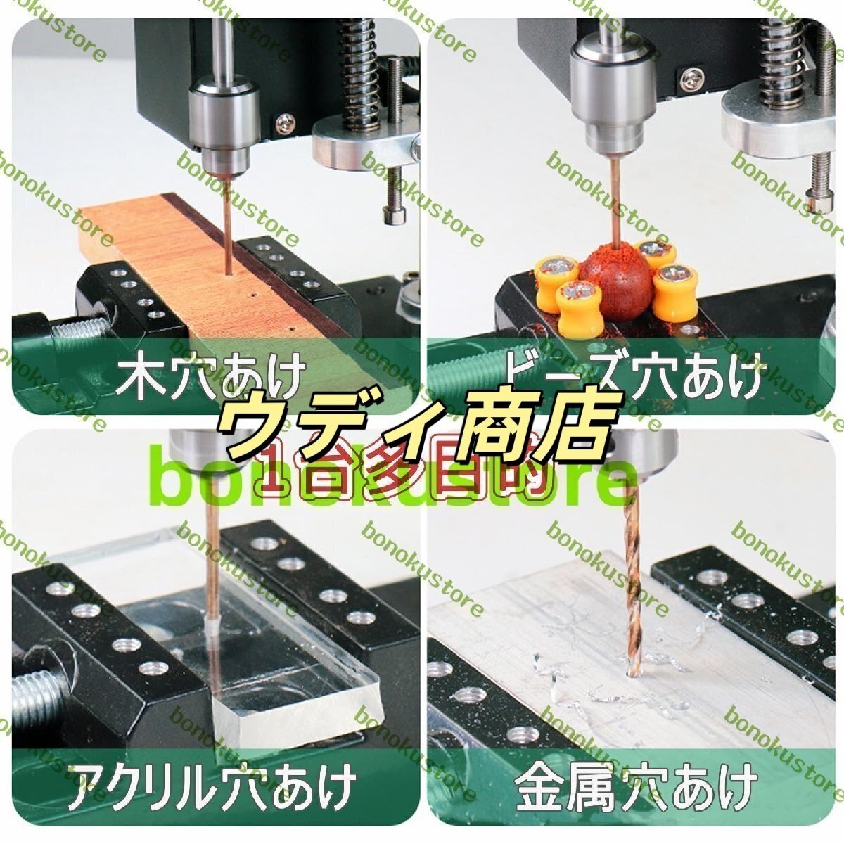 ?【スピード調整可能】ベンチドリルのパワーコンフィギュレーターは7段階のスピード調整が可能。 最低回転数から最高回転数まで簡単に切り替えられます。 8500rpmの最高アイドル速度で、あらゆる穴あけニーズに対応できます。【高品質プロ電動ドリル】小型テーブルドリルは高品質の金属で作られ、錆びにくい、耐摩耗性、長寿命です。電気ドリルスタンド 2.5kgの本体重量で、スタンドは安定でしっかりしており、楽にデスクトップに置くことができます。【精密設計】超強力な775モーターとクランプ幅0.3mm~4mmのドリルチャックを装備していますボール盤。 小物のDIYに特化した設計で、様々な材料をより高精度に穴あけできます。【強度と垂直度調整】柱穴あけ機 調整ホイールはバネ構造を採用し、高さ制限ネジは自由に穴あけ深さを調整できます。 脚部には防振機能が付いています。 また、脚を取り外してテーブルや木材にネジで固定することもでき、使い勝手が良い。【幅広い用途】当社のボール盤は強力で、操作しやすく、速度も安定しています。金属、アルミニウム、木材、プラスチックなどの穴を開けることができます。 不規則な物体でも固定できます。家庭や産業で使用できるミニチュア機械です、ご質問があれば、お気軽にお問い合わせください。商品の説明商品名 : ボール盤サイズ : 230 x 180mm重量 : 3kgモーターモデル : 775/795クランプ範囲 : 0.3-4mm/0.6-6mm最大スピンドル移動量 : 40mm無負荷最高回転数 : 8500r/minスピードコントロールギア : 7速