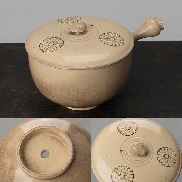 | 古清水の菊紋蒸し器。江戸時代。箱無。 サイズは、幅約16.5x12cm、高さ約10.5cm。 縁からニュウがあります。 持手に欠けがあります。 状態、詳細は画像でご確認ください。 |