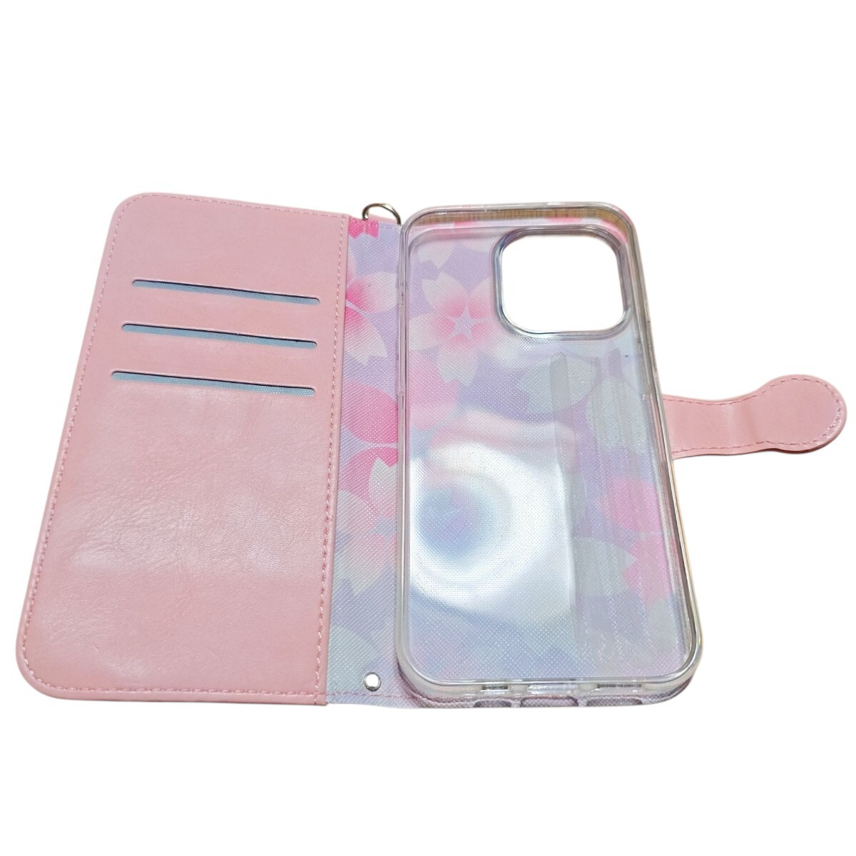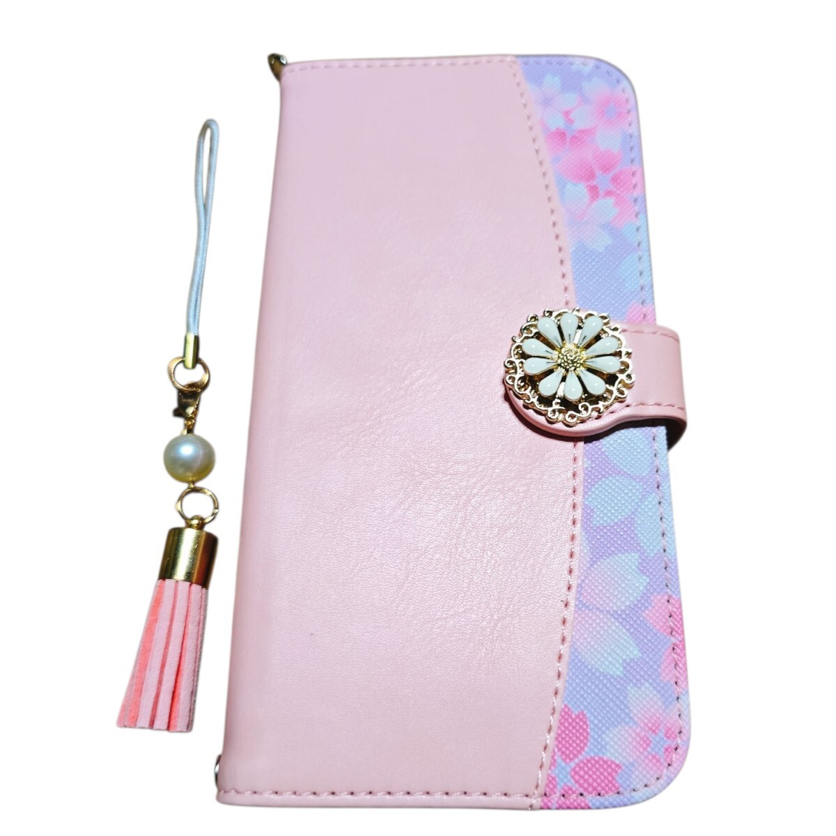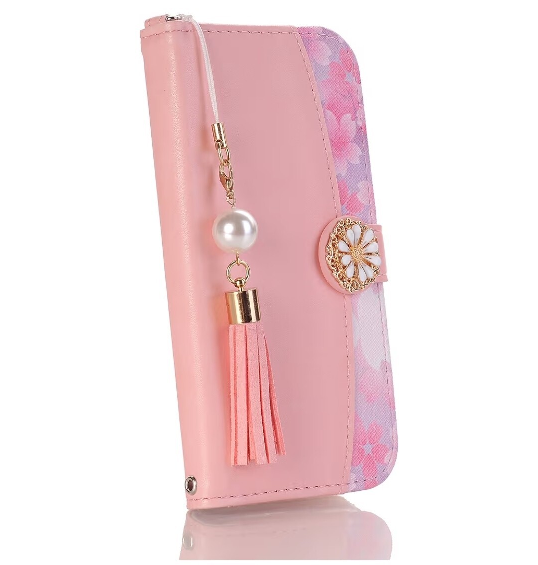 女性らしいピンクを基調とし、桜の柄とゴールドの金具がアクセントになり、とても華やかで可愛らしいケースです。タッセルストラップが手元をおしゃれに飾ります。