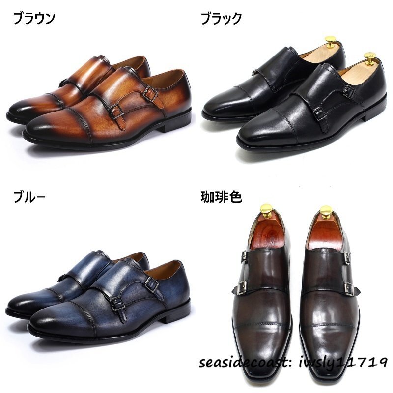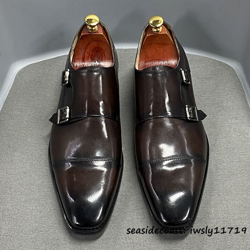 入手困難*ダブルモンクストラップ メンズ 本革 レザーシューズ 職人手作り ビジネスシューズ 最上級牛革 紳士靴 革靴 新品 珈琲色 26.5cm