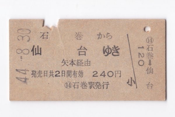 ●国鉄●石巻線【 石巻から仙台ゆき 矢本経由 240円 】A型券 昭和44年 石巻駅発行【13387】