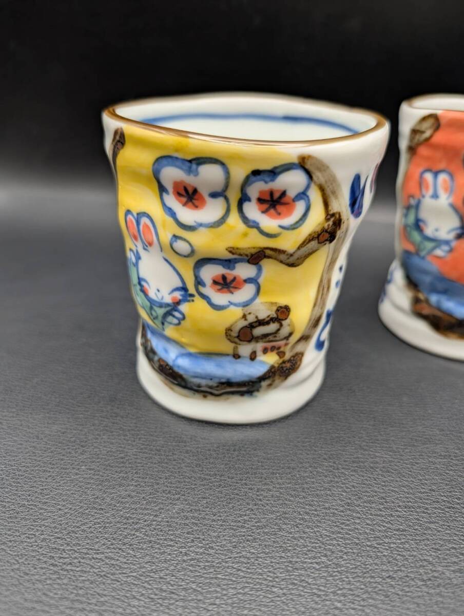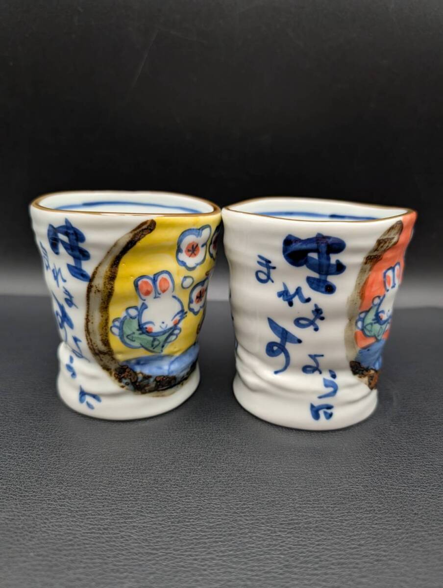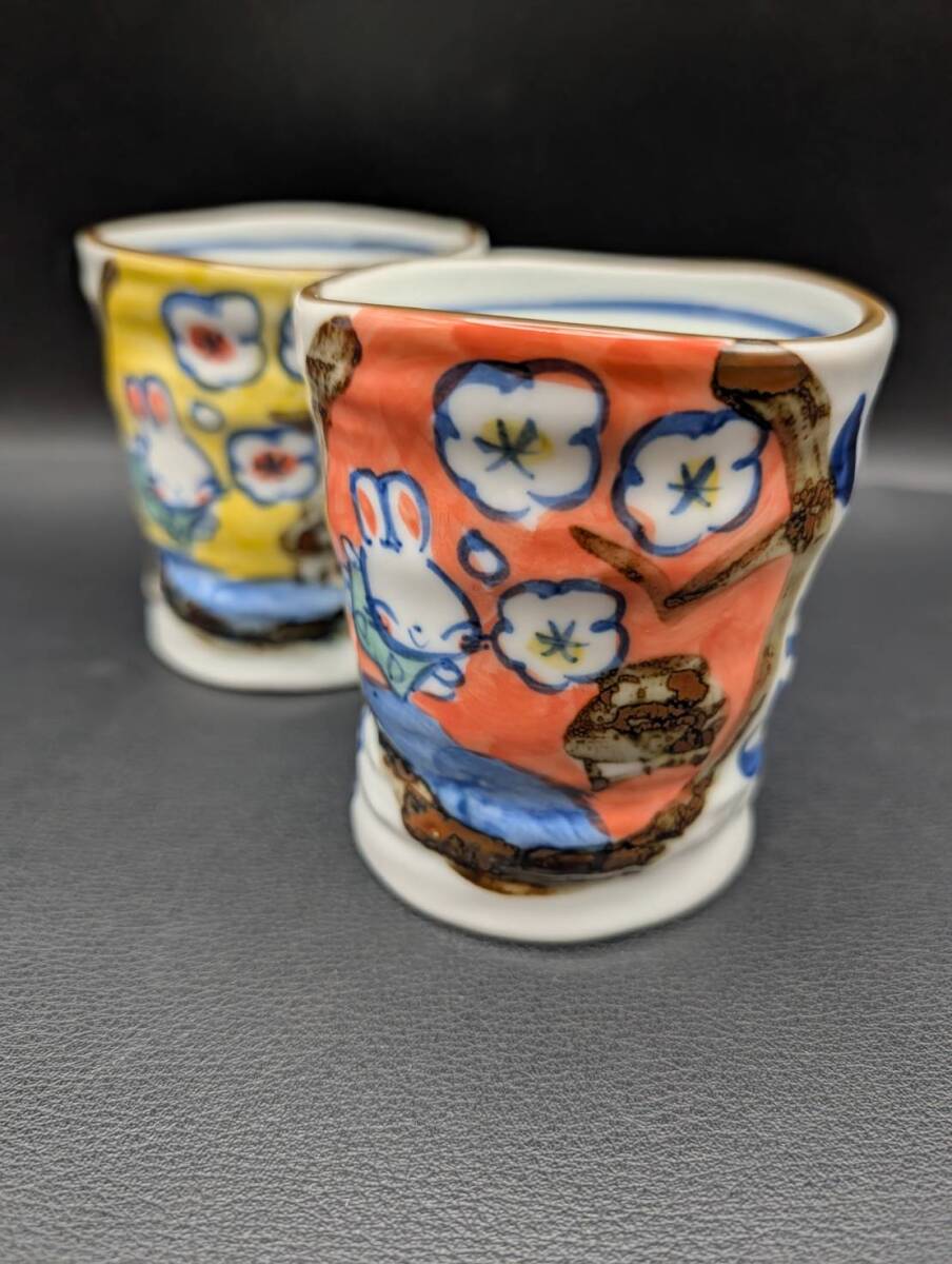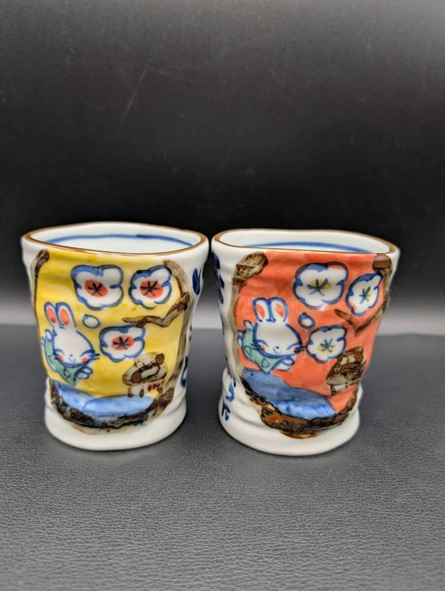 未使用『夕立窯 どすこい カップ 2個 セット ペア うさぎ』茶器 湯呑 湯のみ 作家 銘在銘 陶印 裏印 骨董 兎 アンティーク コレクション