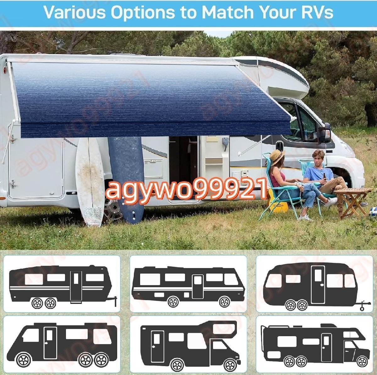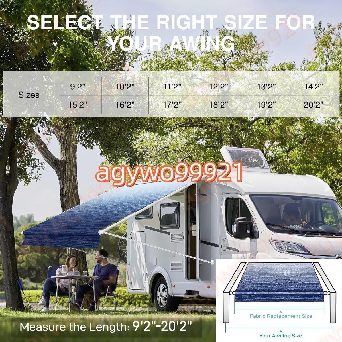 【パーフェクトフィット保証】 - RVオーニングの交換用生地は、9フィート2インチから20フィート2インチまで、様々なサイズをご用意しており、ほとんどのRVに適合します。ご購入前に、オーニングアームの中心から左右までの距離を測り、キャンピングカーに最適なサイズをお選びください。例えば、RVオーニングの長さが16フィートの場合、16フィートスタイル(生地の厚さ15フィート2インチ)をお選びください。