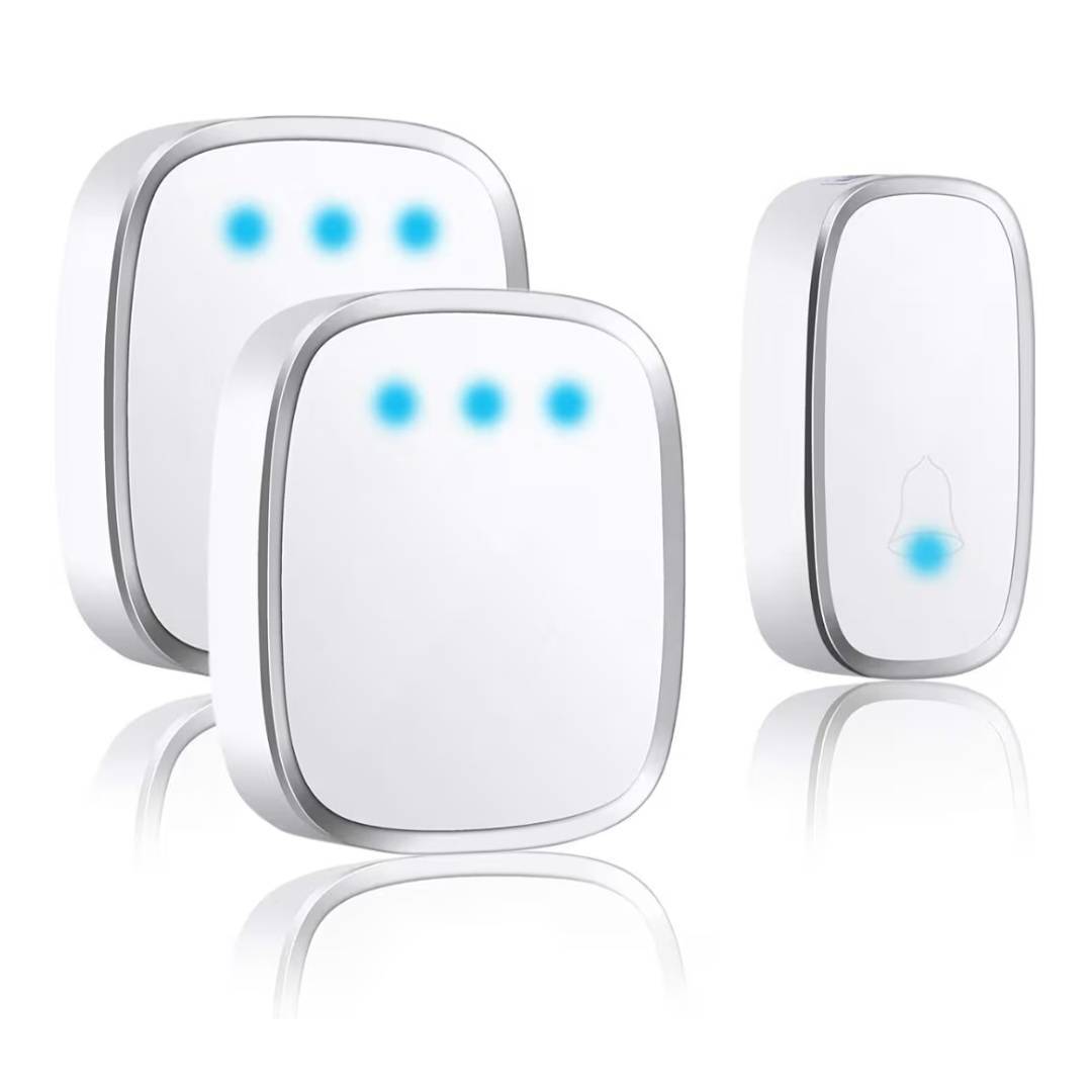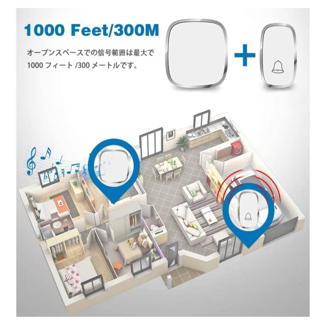 こちらの呼び出しチャイムは障害のない場所で、ワイヤレス通信が最大300メートルの長距離まで届けます。高感度受信機で、壁、木ドア、鋼ドアなどに安定受信でき、2階建ての建物でもご使用いただけます。