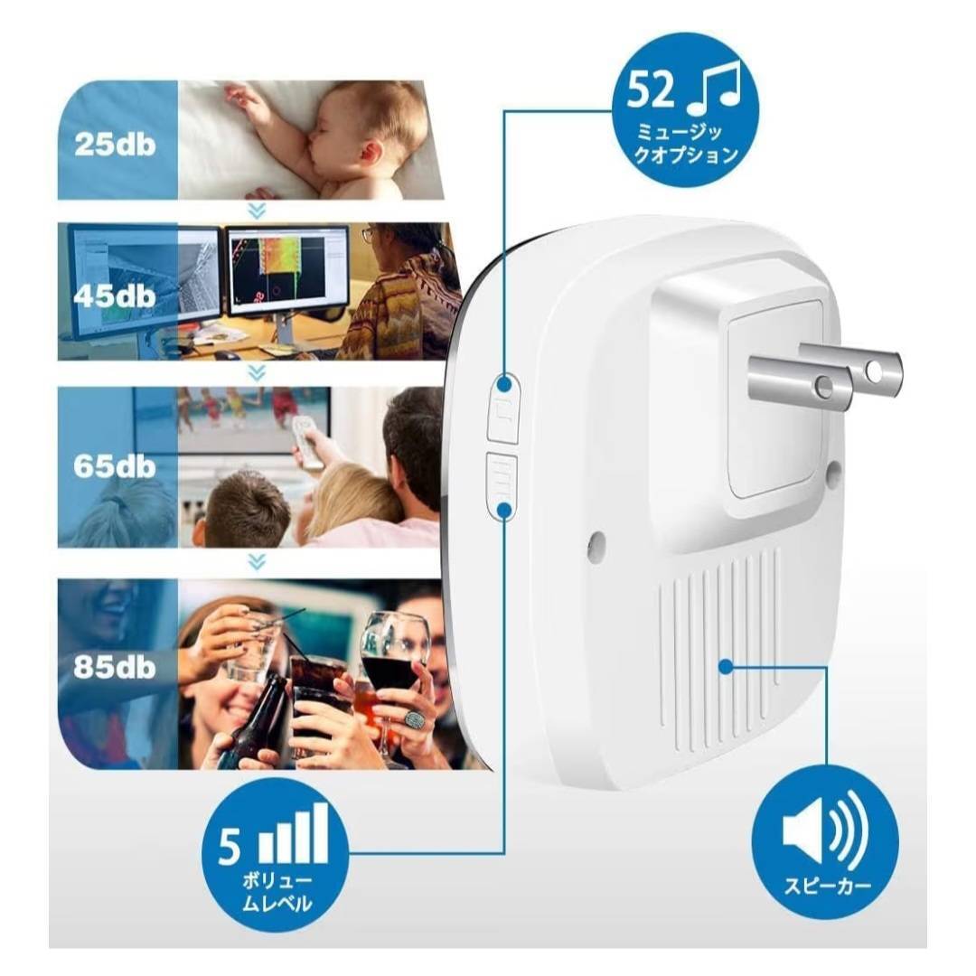 こちらのワイヤレスチャイムは大音量呼び出し音で、音量4段階調節でき、ボリュ—ム可変範囲は0dB~100dBです。36曲が選択可能で多種多様の環境と要求を満たされます。大音量で聴力の弱い方にもお勧めします。