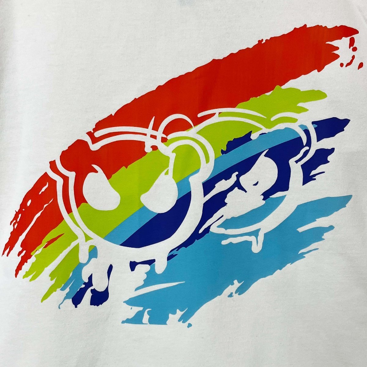バックにはレインボープリントを大胆に配置。その下にあしらわれたスタイリッシュな英字ロゴが、夏らしい明るさと爽やかな印象を演出します。後ろ姿までおしゃれに決まる一着です。フード付きで、体型を気にせずゆったりと着こなせます。