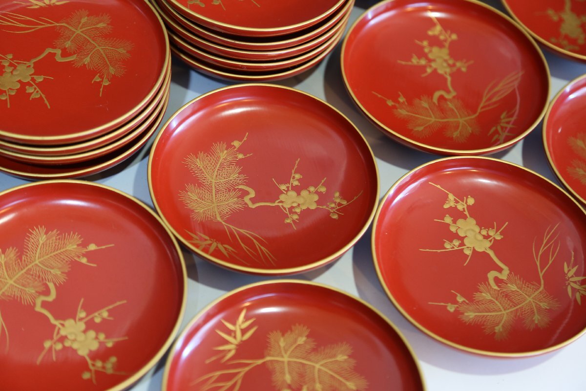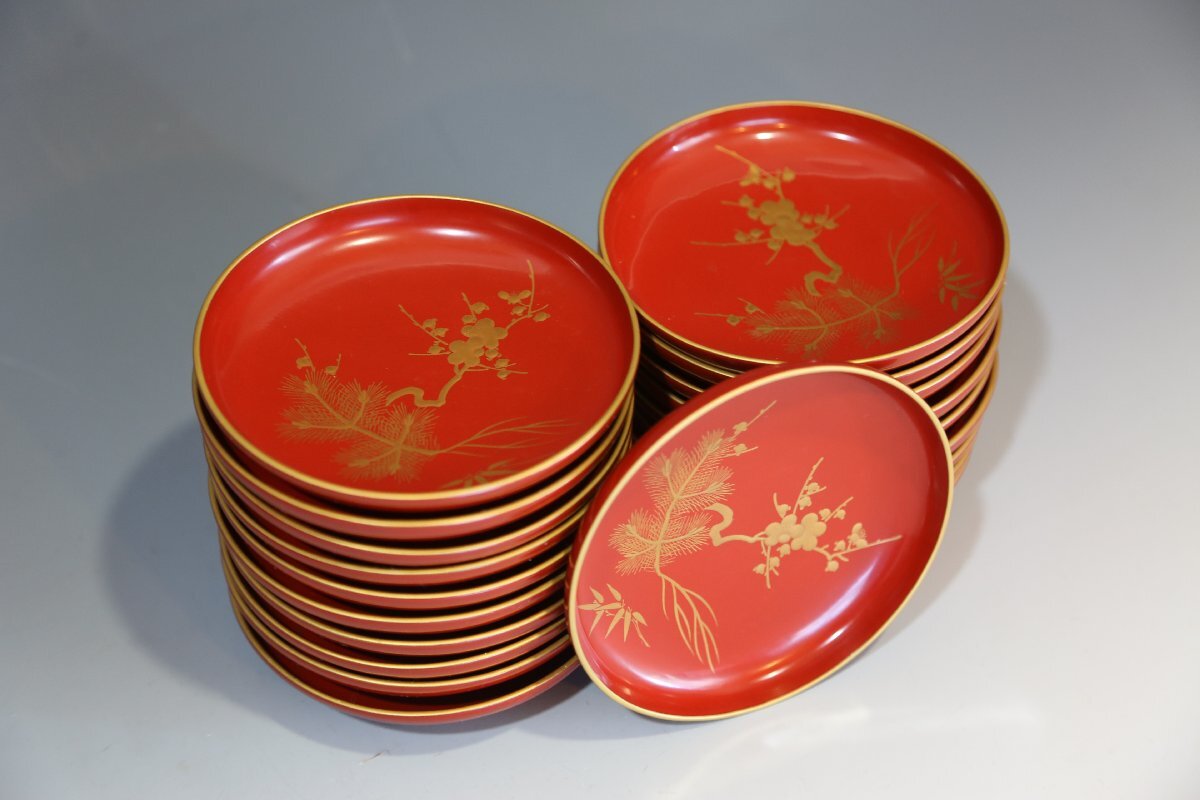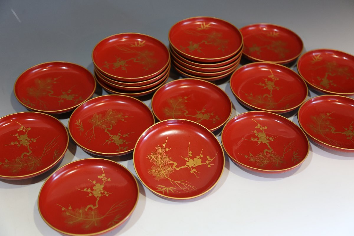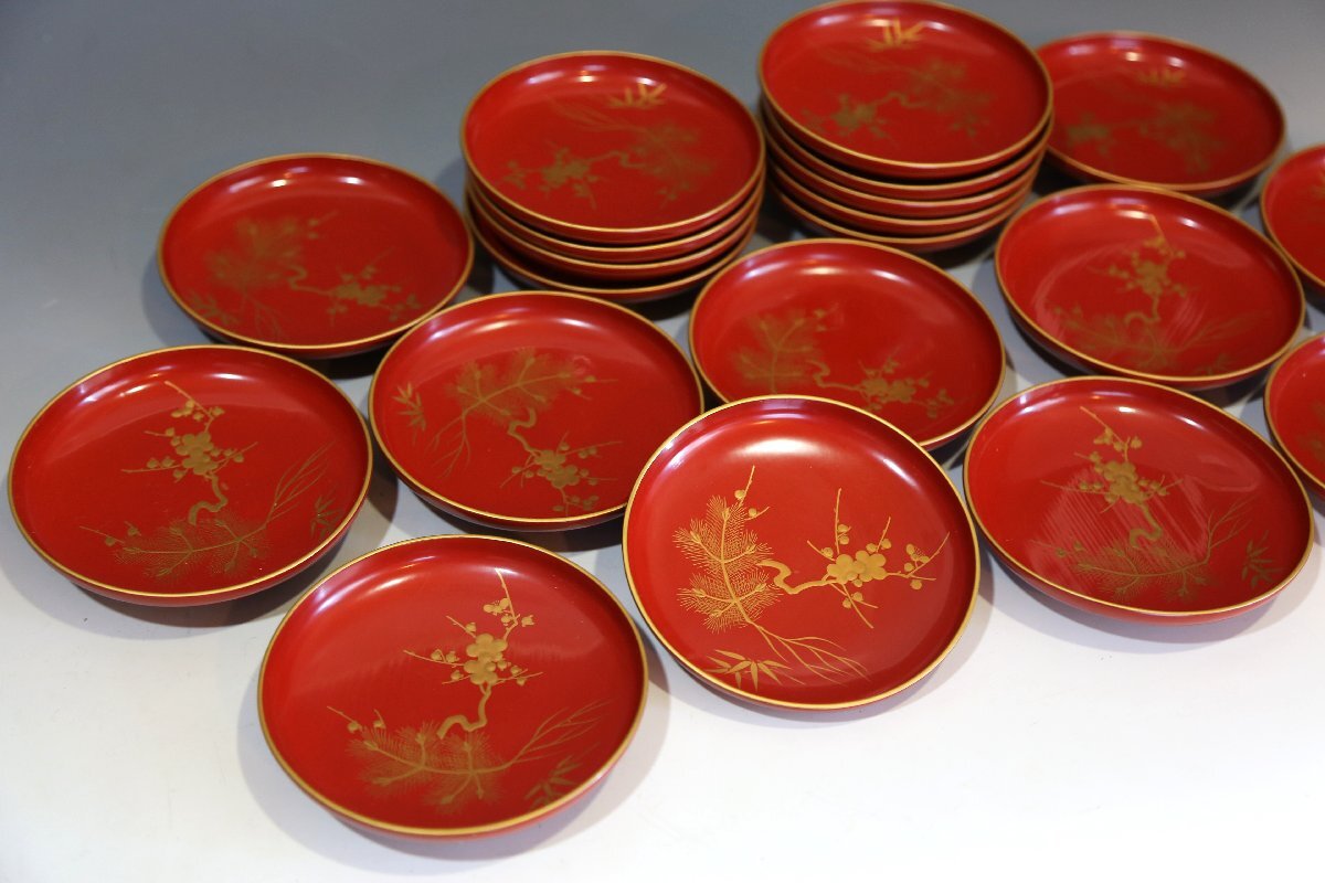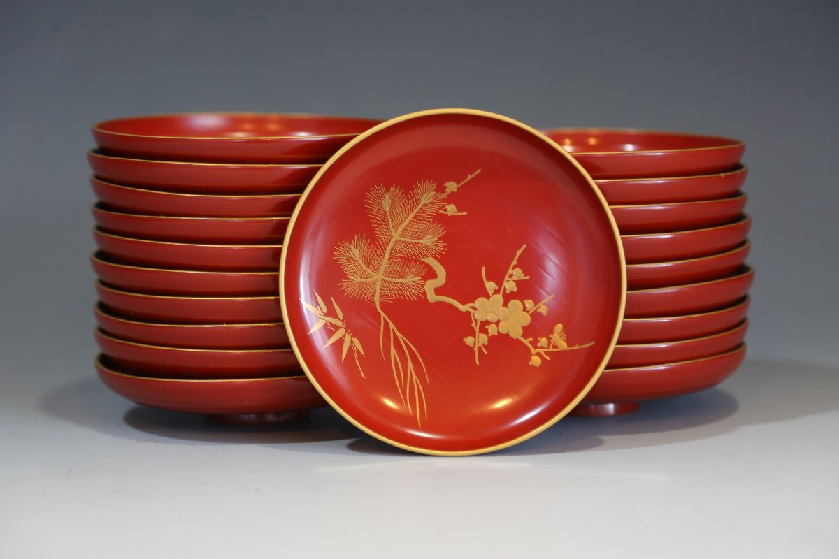 ★★★ 大正期 木製 朱塗 松竹梅蒔絵 引き盃 20客 ★★★