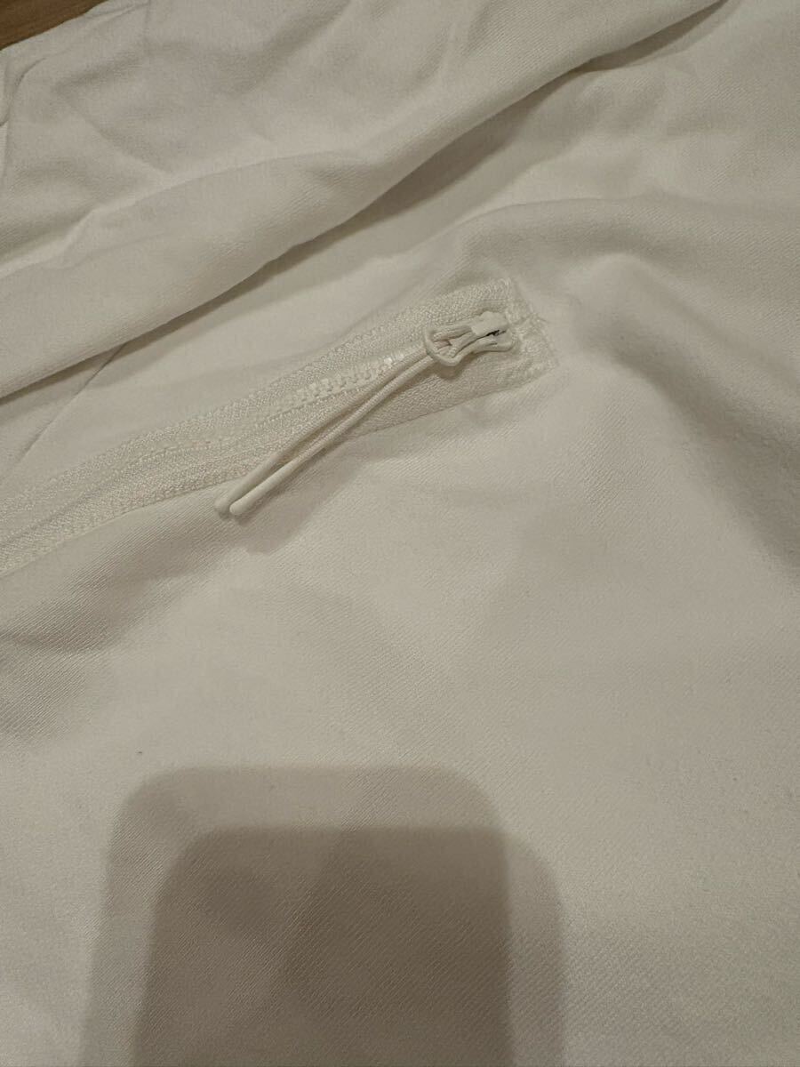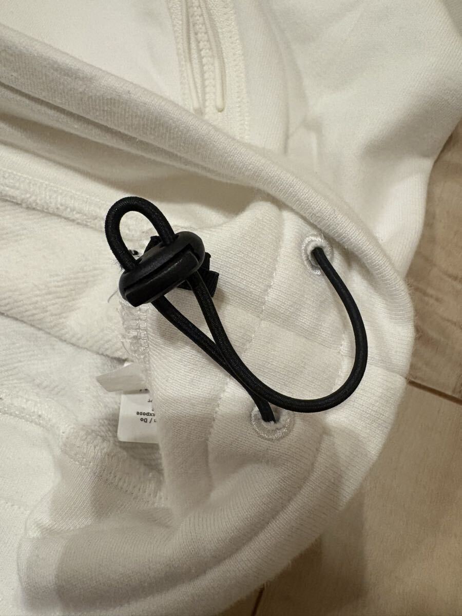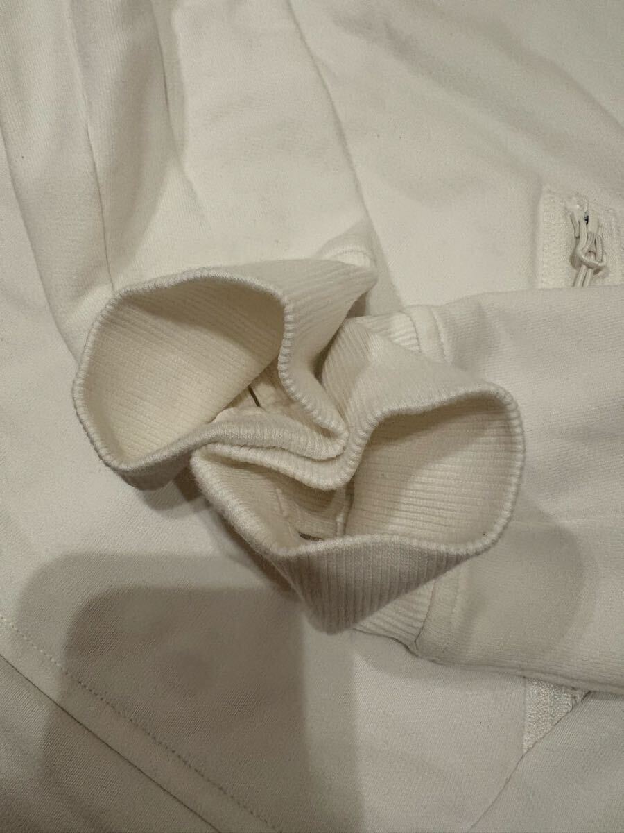 裾にドローコード、フロントと左袖にジップポケット、袖リブにサムホールの付いた、テックウェアのディテールを備えたアイテムです。