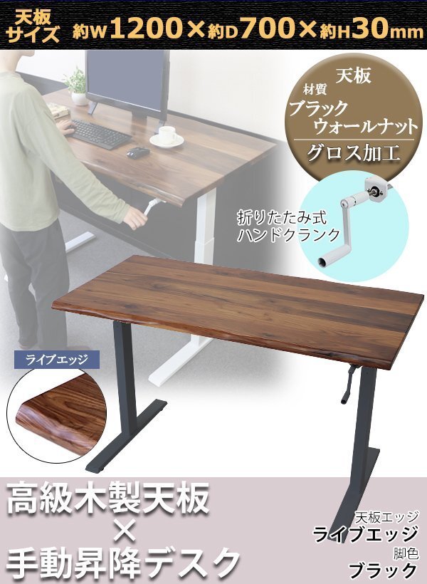 | 商品名 | 送料無料 昇降デスク 手動 W1200×D700×H735〜1185mm ブラックウォールナット材 高級 木製 天板 グロス加工 耐荷重約70kg(脚部) スタンディングデスク 上下昇降 デスク 手動昇降 上下昇降 昇降デスク 高さ 調整 オフィスデスク 昇降式デスク 昇降テーブル ライブエッジ 脚色 ブラック hk01120bkwag |