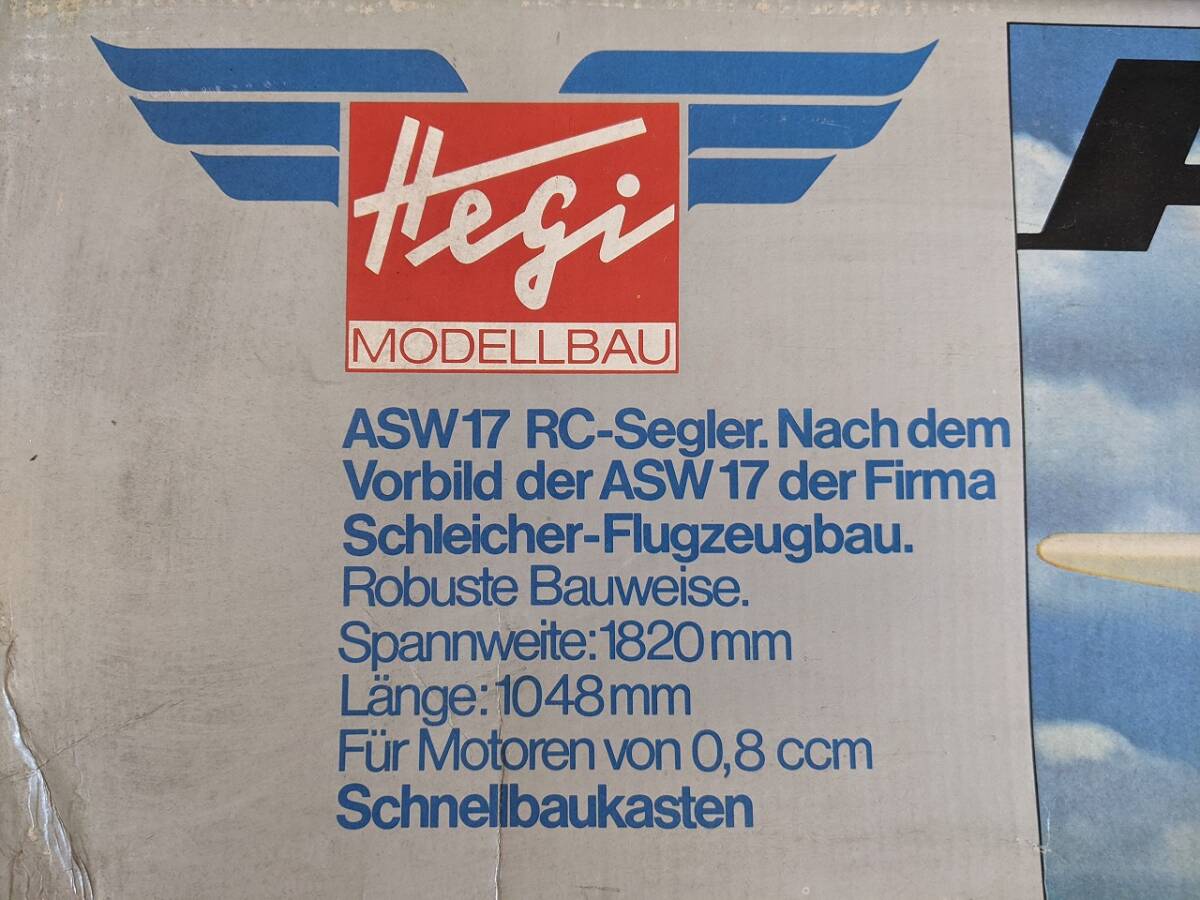 古い機体ですが、バルサ等の木材の劣化はみられません。内容確認と撮影のために中身は一度箱の外に出しましたが、ざっと見た限りパーツは全部あるようです。西ドイツ製と書いてあるので、1990年以前のものだとは思います。HEGI-MODELLBAUについては、知人によれば1970年代に流行った模型屋さんとのことです。