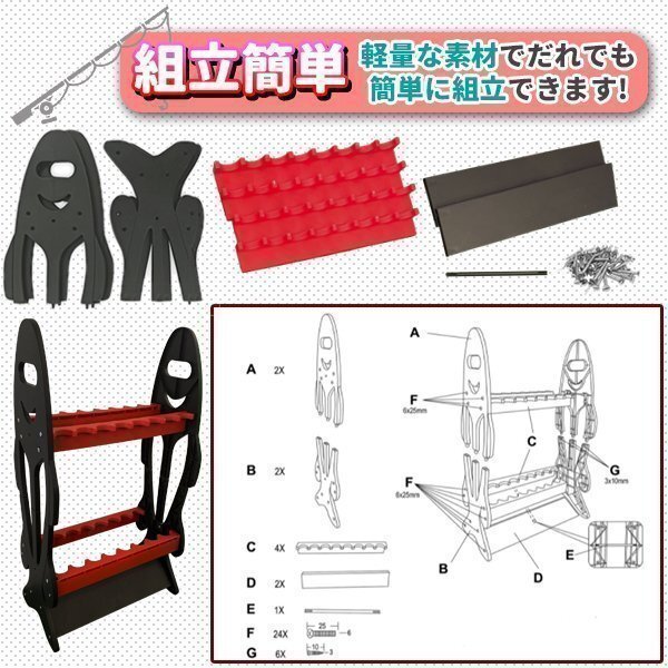 ロッドスタンド 16本 釣り竿 ロッドホルダー ロッド スタンド プラスチック 組立 ラック 収納 ディスプレイ レッド 赤