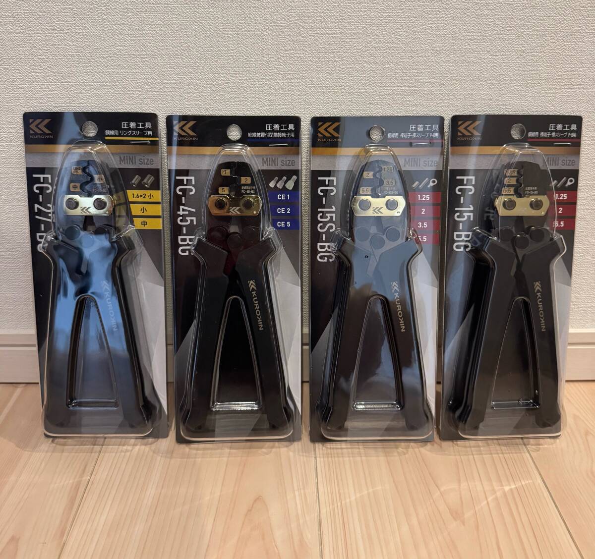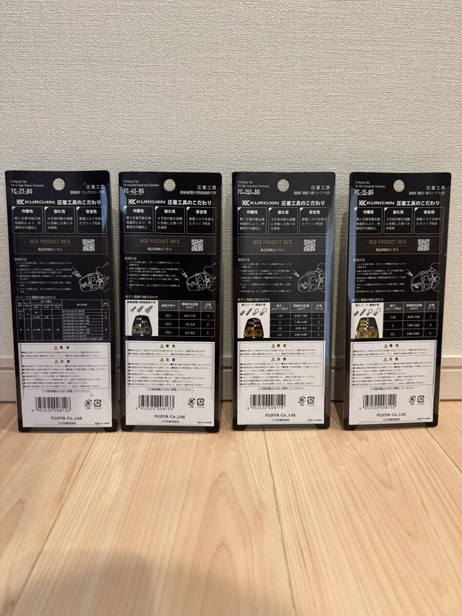 4機種の四本セット組で出品です!! フジ矢・KUROKIN / FC-15-BG、FC-15S-BG、FC-27-BG、FC-45-BG 【特徴】 ・独自開発の圧着機構で、圧着荷重を軽減。 ・端子の入れ間違いを起こしにくいデザインで、作業ミスを防止します。 ・端子の仮止め機能付きで、作業中の扱いやすさを向上。 ・くびれ部の幅を狭くすることで、指が動かしやすく、握り込みやすいグリップ形状を採用。 ・グリップが抜けにくい本体設計により、長くご使用いただけます。 ・また、グリップを長くすることで、力の必要な大きな端子もグリップの外側を握ることで、ラクに圧着が可能です。 【商品仕様】 FC-15-BG 全長186mm 重量235g 対応端子:裸端子および裸スリーブP・B 端子・スリーブ呼び:1.25・2・5.5 FC-15S-BG 全長186mm 重量235g 対応端子:裸端子・裸スリーブP・B 端子・スリーブ呼び:1.25・2・3.5・5.5 FC-27-BG 全長186mm 重量235g 対応端子:リングスリーブ 端子・スリーブ呼び:1.6×2小・小・中 FC-45-BG 全長186mm 重量235g 対応端子:絶縁被覆付閉端接続子 端子・スリーブ呼び:CE1・CE2・CE5 ◆詳細はメーカーホームページをご参照ください。 ◆ノークレーム、ノーリターンでお願い致します。 ◆ラベルなどにダメージや製品に擦り傷などあります、神経質な方の入札はご遠慮下さい ◆落札後24時間以内のご連絡、2日以内にご入金出来る方のみの入札をお願いします。