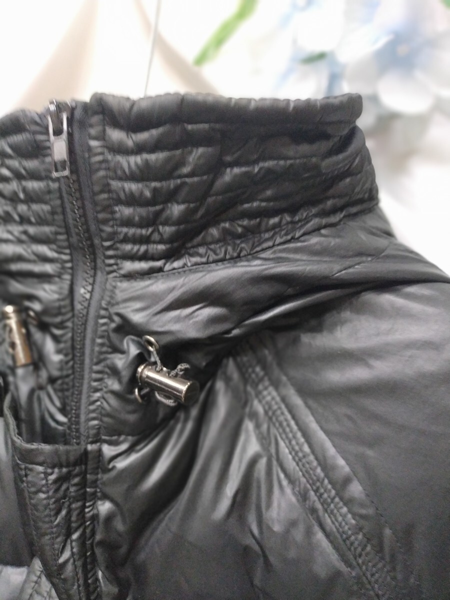 微光沢のあるポリエステルタフタ素材にたっぷりのダウンが入っています。ポリエステルタフタはダウンジャケットに使われるポピュラーな生地です。