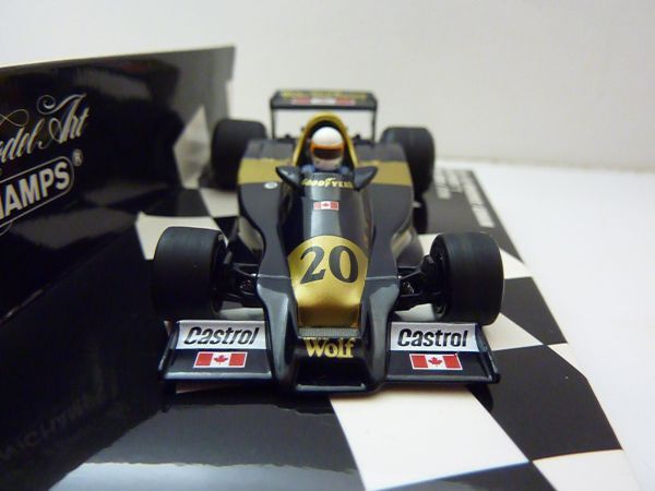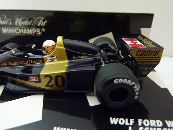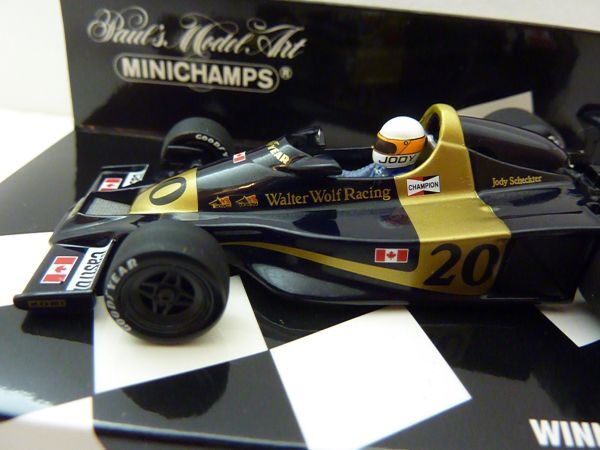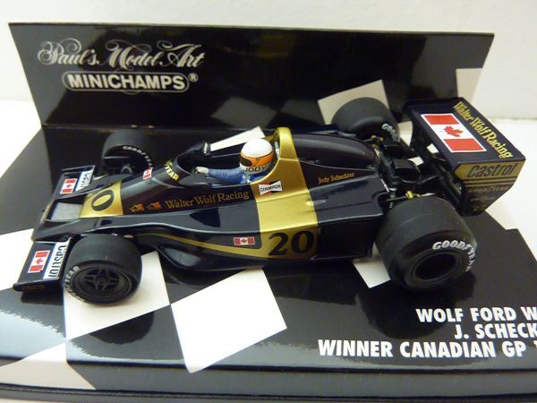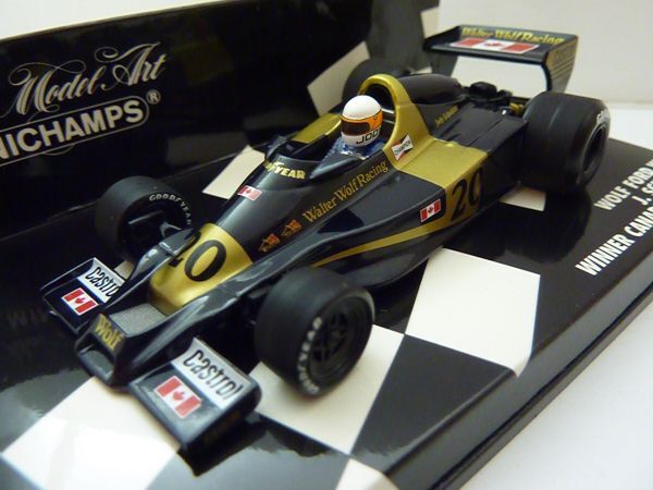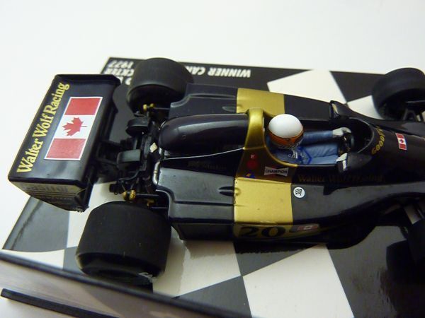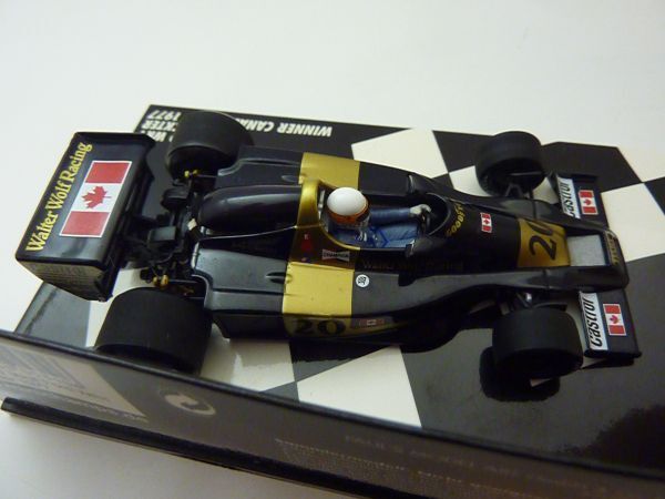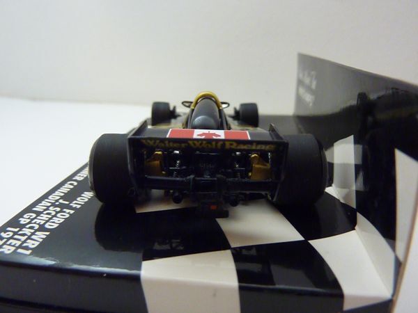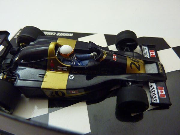 1/43スケールのミニチャンプス(PMA)製ダイキャストモデル。製品番号400 770120。製造上の多少のデカールの曲がり・シワ・浮き・傷・カケ、塗装の汚れ・傷、パーツの取り付けの曲がりなどはご理解ください。ボディの紺色や金色の塗装に細かいダマ、荒れが多く見られます。タイヤが少し湿っているように見えます。リアウィングのステイやその前の部品周辺が、接着剤の世汚れか、湿ったように荒れているように見えます。リアウイングおよびリアサスペンション周りのパーツの取り付けに若干曲がりがあります。タイヤが少し湿っているように見えます。台紙に多少傷、汚れが見られます。ケースに多少擦り傷があります。ご了承ください。