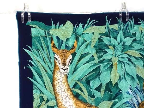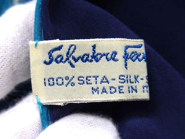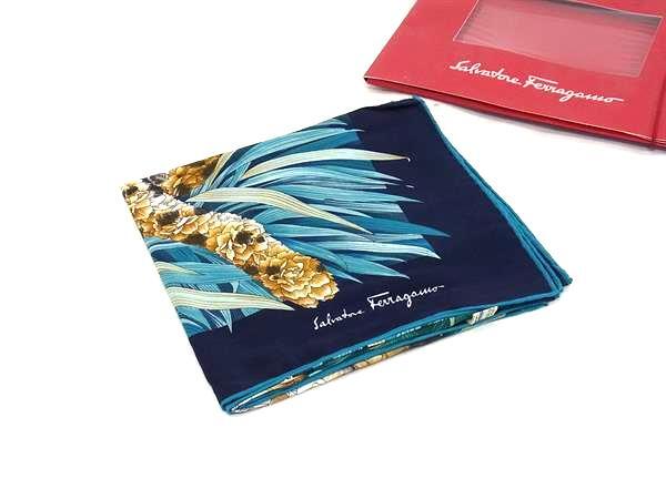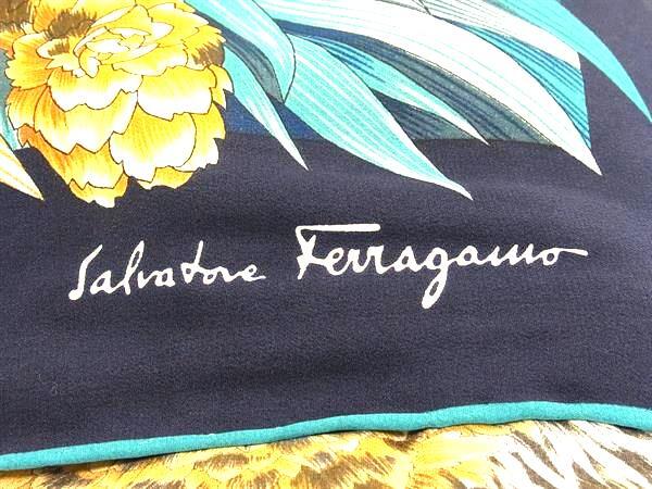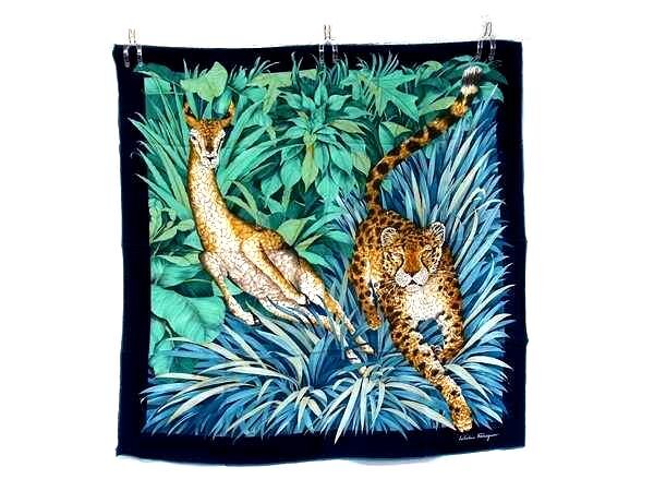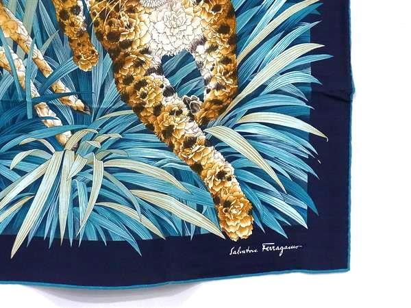 1円 ■美品■ Salvatore Ferragamo フェラガモ シルク100% 虎 鹿 アニマル スカーフ ストール ショール ブルー系×ブラウン系 BR0877