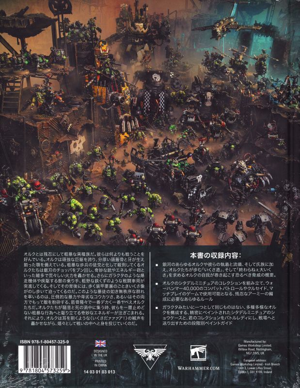 • ゲーム「ウォーハンマー40,000」オルクの勢力の背景設定やゲームルール、イラストやミニチュア作例写真などを掲載するハードカバー版書籍(152ページ)。