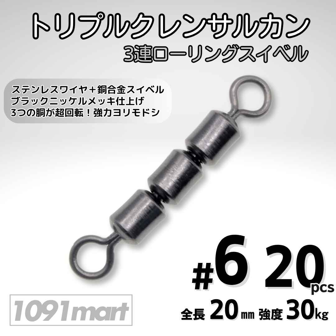 トリプルクレン サルカン 3連 ローリングスイベル #6 全長20㎜ 強度30㎏ 20個セット 強力ヨリモドシ 超回転で糸ヨリ解消!【1091mart】