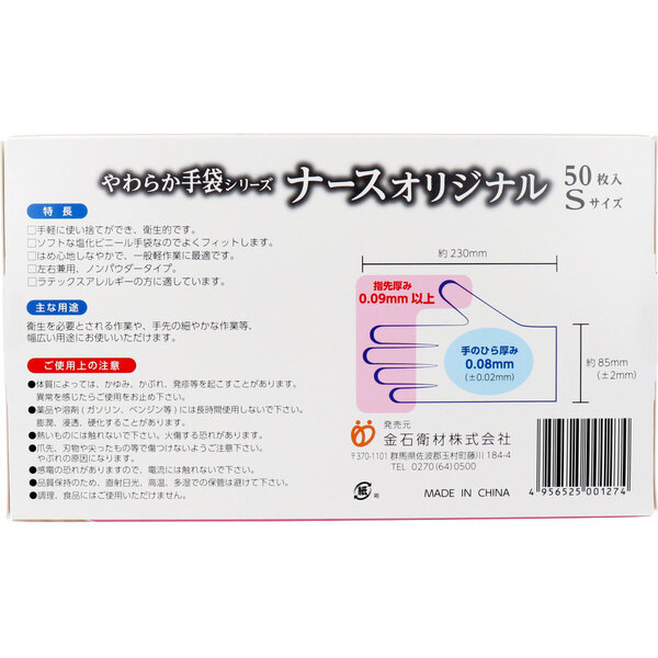 AQL1.5未満、ビニール素材、ノンパウダー、指先厚0.09mm以上の塩化ビニール手袋! ソフトな塩化ビニール手袋なのでよくフィットします。 手軽に使い捨てができ、衛生的です。 ・はめ心地しなやかで、一般軽作業に最適です。 ・左右兼用、ノンパウダータイプです。 ・ラテックスアレルギーの方に適しています。 個装サイズ:215X127X40mm 個装重量:約280g 内容量:50枚入 製造国:中国 【発売元:金石衛材株式会社】 【主な用途】 衛生を必要とされる作業や、手先の細やかな作業等、幅広い用途にお使いいただけます。 【サイズ】 Sサイズ・・・全長約230mm×幅約85mm(±2mm)/指先厚み0.09mm(±0.02mm)、手のひら厚み0.08mm(±0.02mm) 【ご注意】 ・体質によっては、かゆみ、発疹等を起こすことがあります。 異常を感じたらご使用をお止め下さい。 ・薬品・溶剤(ガソリン、ベンジン等)には長時間使用しないで下さい。 膨潤、浸透、硬化することがあります。 ・熱いものには触れないで下さい。 火傷する恐れがあります。 ・爪先、刃物や尖った物等で傷つけないようご注意下さい。 やぶれの原因になります。 ・感電の恐れがありますので、電流にはふれないで下さい。 ・品質保持のため、直射日光、高温、多湿での保管は避けて下さい。 ・調理、食品にはご使用いただけません。 注意事項 予告なく成分・パッケージが変更になることがございます。 予めご了承ください。 *予告なく成分・パッケージが変更になることがございます。予めご了承ください *ダンボールを使用して発送する場合には、入数以下の個数の場合、 中古ダンボールを使用する場合があり、ご注文の商品とは異なるダンボールになる場合があります。 あらかじめ、ご了承ください。 |
