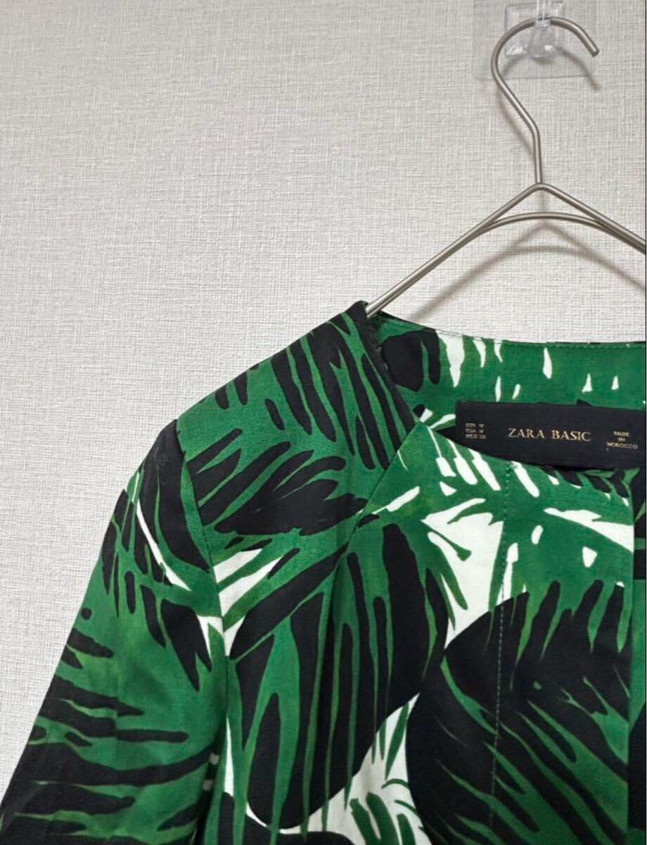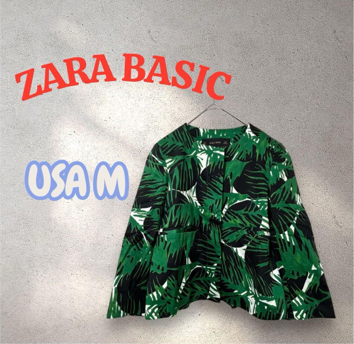 鮮やかな葉柄デザインのノーカラージャケット、春夏に最適。