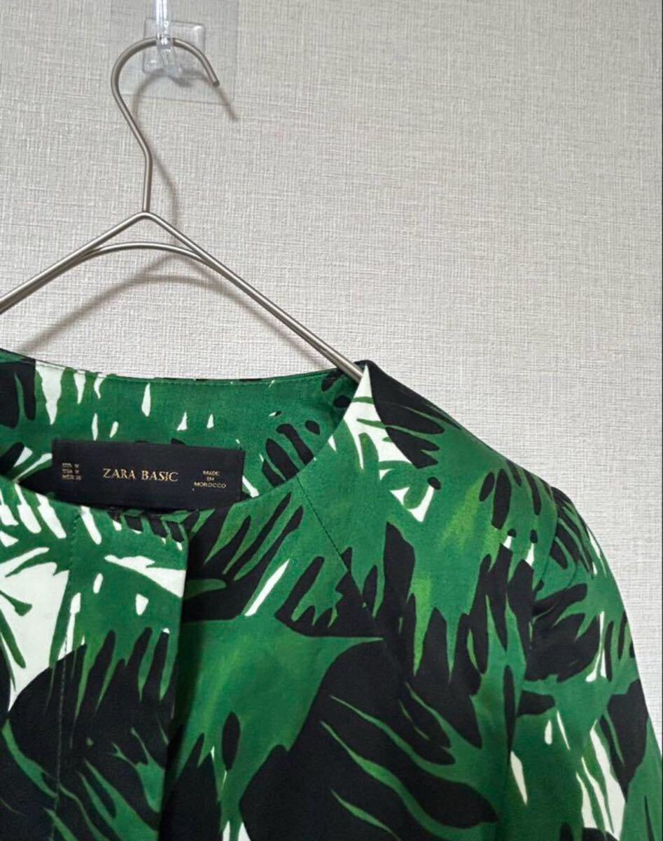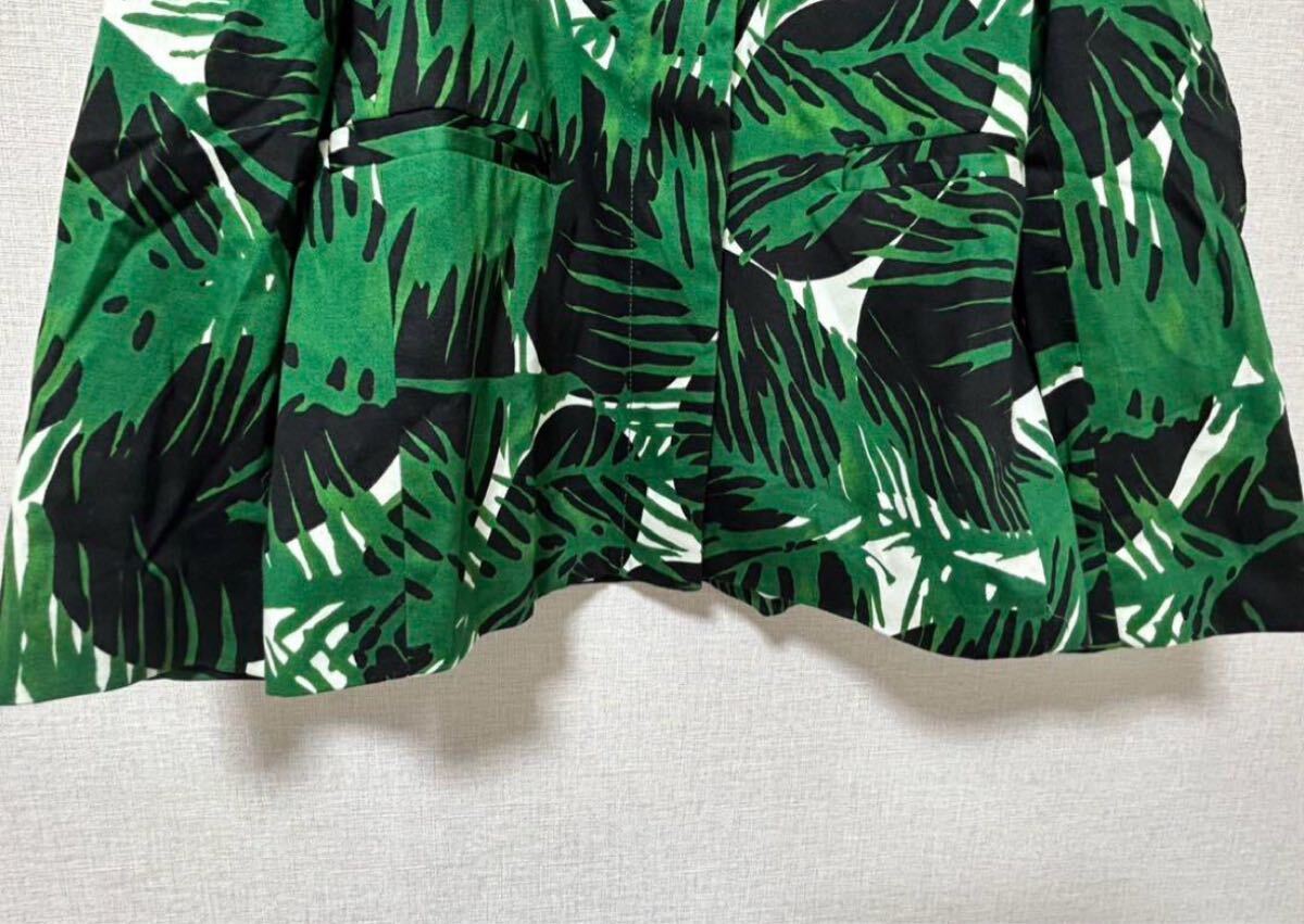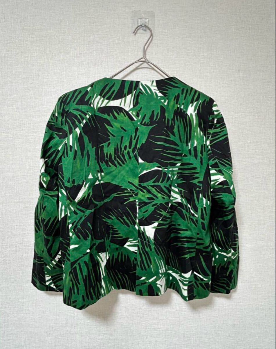 グリーンとブラックのボタニカル柄が特徴的なノーカラージャケット