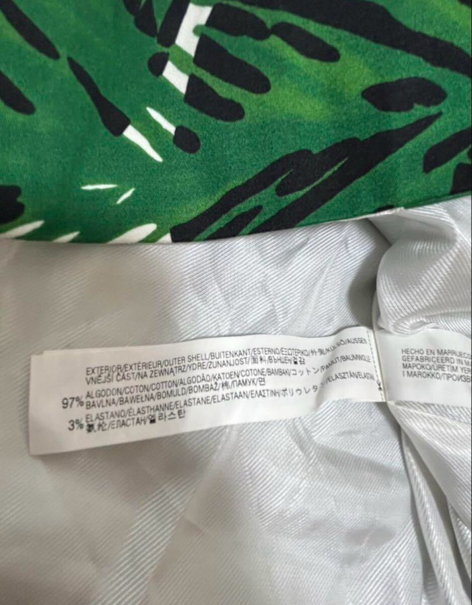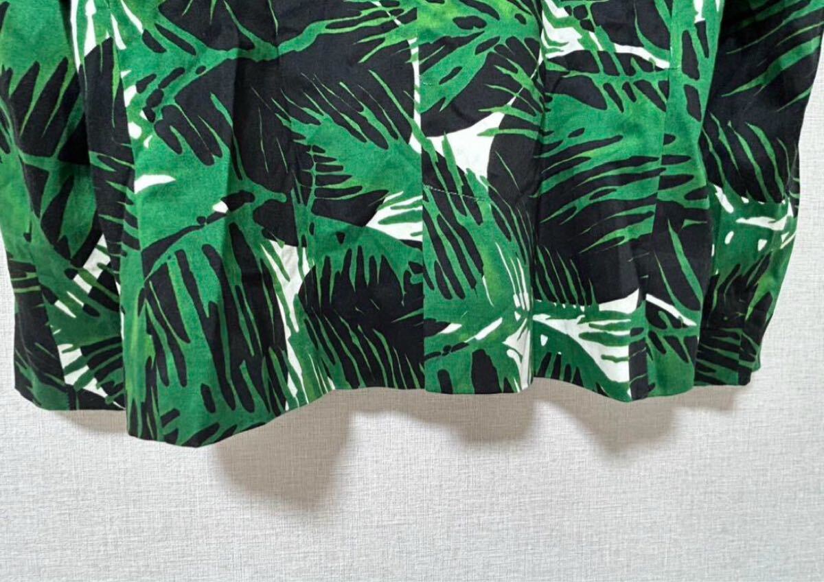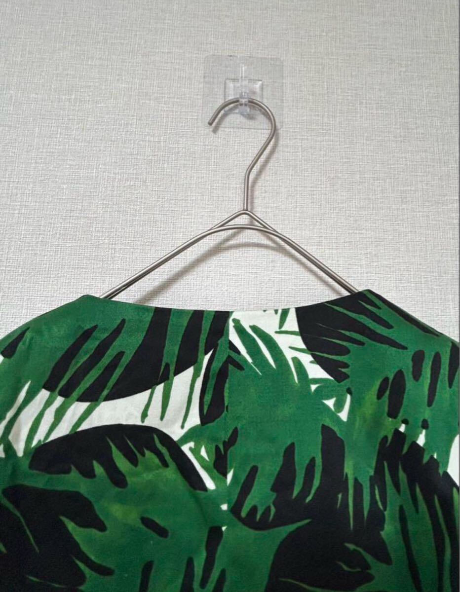 グリーンとブラックのボタニカル柄が特徴的なノーカラージャケット