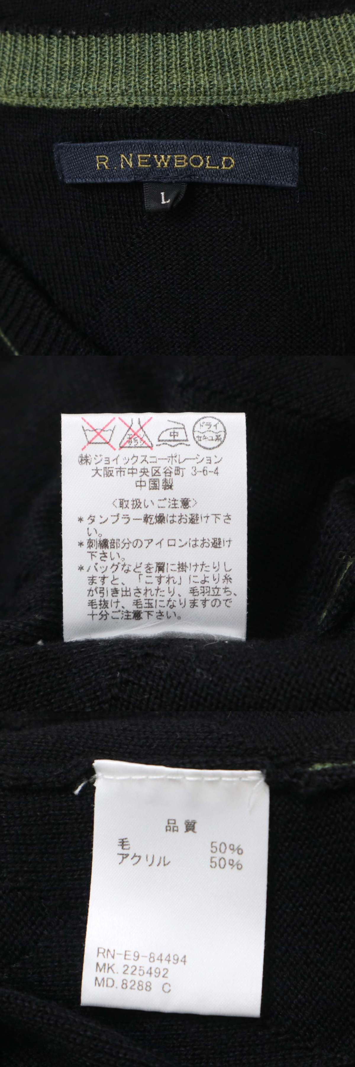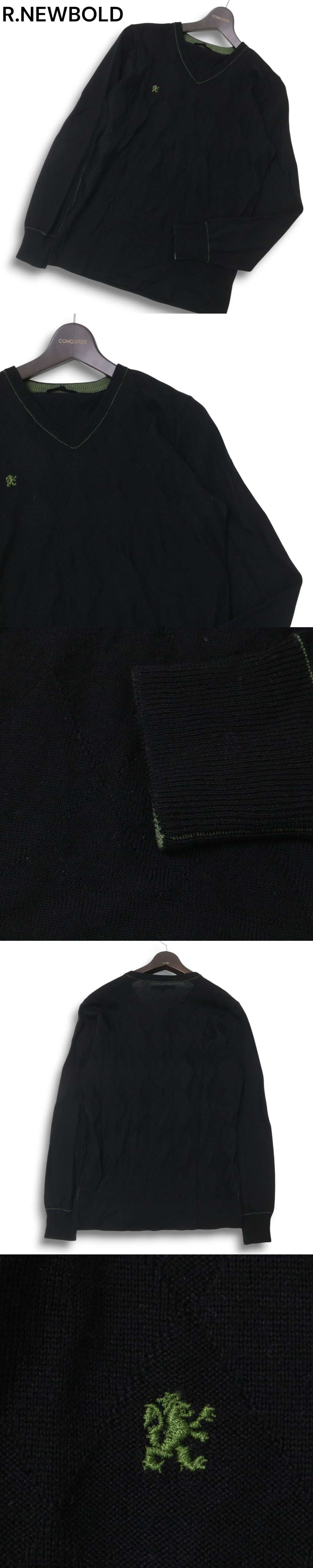 R.NEWBOLD ポールスミス 秋冬 ロゴ刺繍★ ウール ダイヤ柄 Vネック ニット セーター Sz.L メンズ 黒