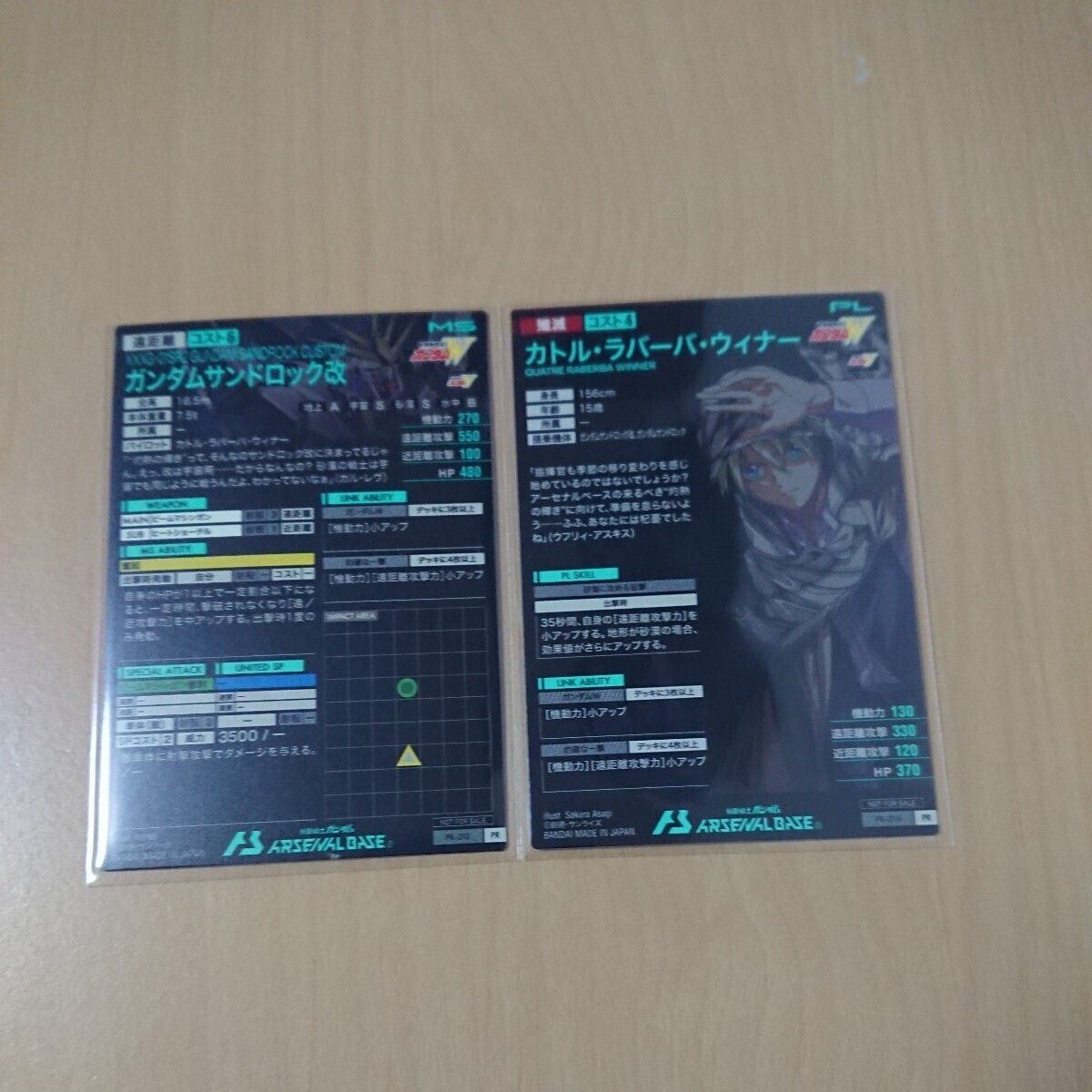 ガンダムアーセナルベース、プロモ、ガンダムサンドロック改 & カトル・ラバーバ・ウィナーの出品となります。未使用品です。パック開封後、スリーブに入れて保管していますが初期キズなど気になさる方はご遠慮ください。配送料金は梱包代込みで全国一律、120円とさせていただきます。他の出品との同梱は対応いたします。ノークレム、ノーリターンにてお願いいたします。