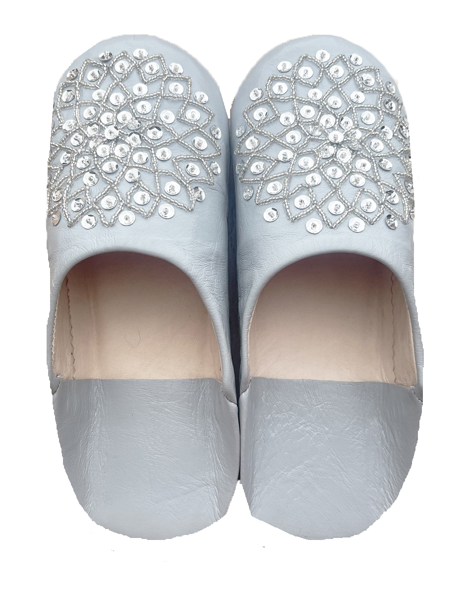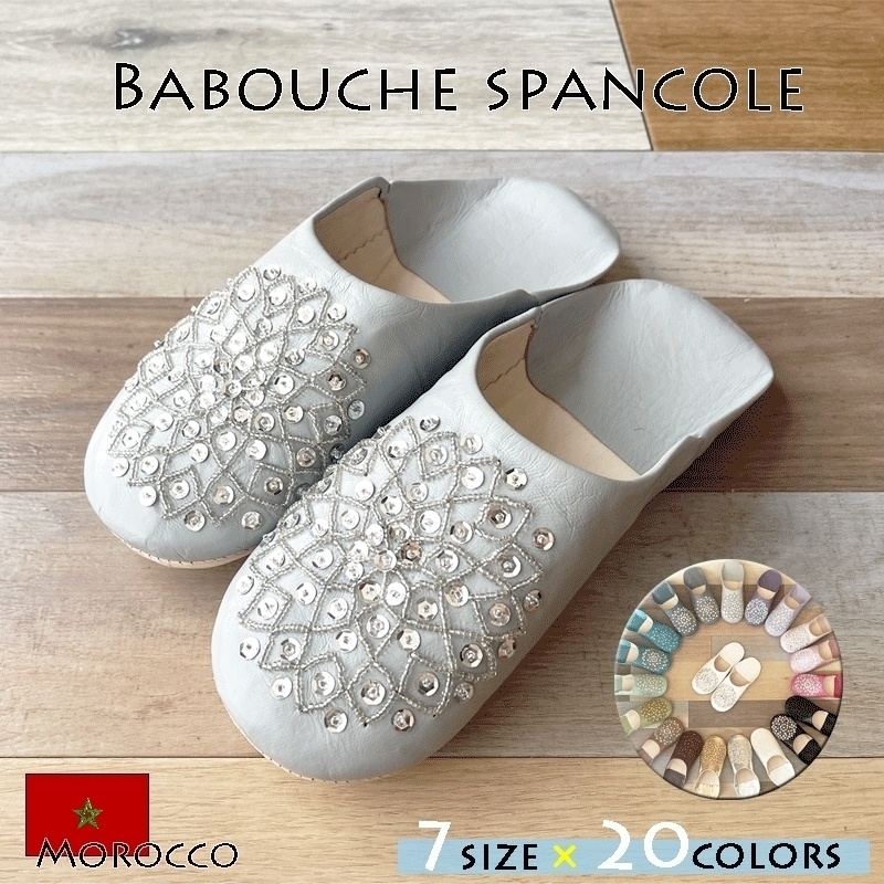 当店のバブーシュはすべてモロッコの職人さんが手作りで作製したものです。工場で作った大量コピー製品ではないので小さな傷・汚れ、染色の際のむら、ボンドのはみだし、ボールペンの跡、若干のサイズの誤差、同じデザインでも左右非対称、入荷時によって画像とのデザインやスパンコールの色の違いなどのハンドメイド感についてはご了承のうえ、ご注文をお願いいたします。上記のことを踏まえての価格設定となっております。