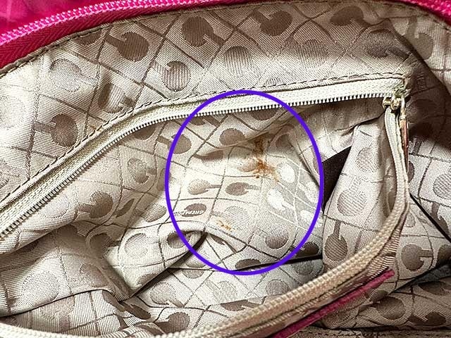 持ち手、バッグ口の布部分に毛羽立ちあり。