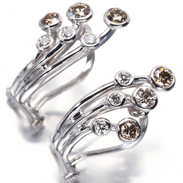 伸びやかな3ラインのデザインと共に厳選ブラウン&クリアダイヤモンドの輝きをベゼルセッティングで演出したカシケイの優雅なイヤリングです。 |