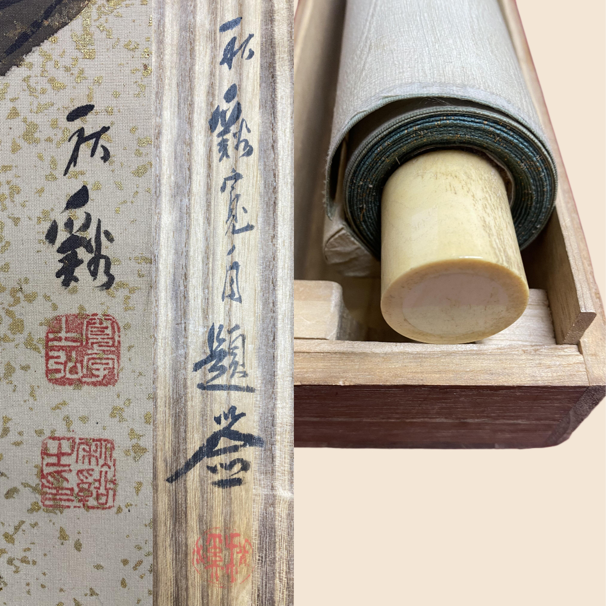掛軸の軸先ですが、配送中の振動・気温・経年劣化等で外れてしまうことがあります。軸先の外れは、返品の対象にはなりません。大変お手数ですが、お客様ご自身での修復をお願い致します。