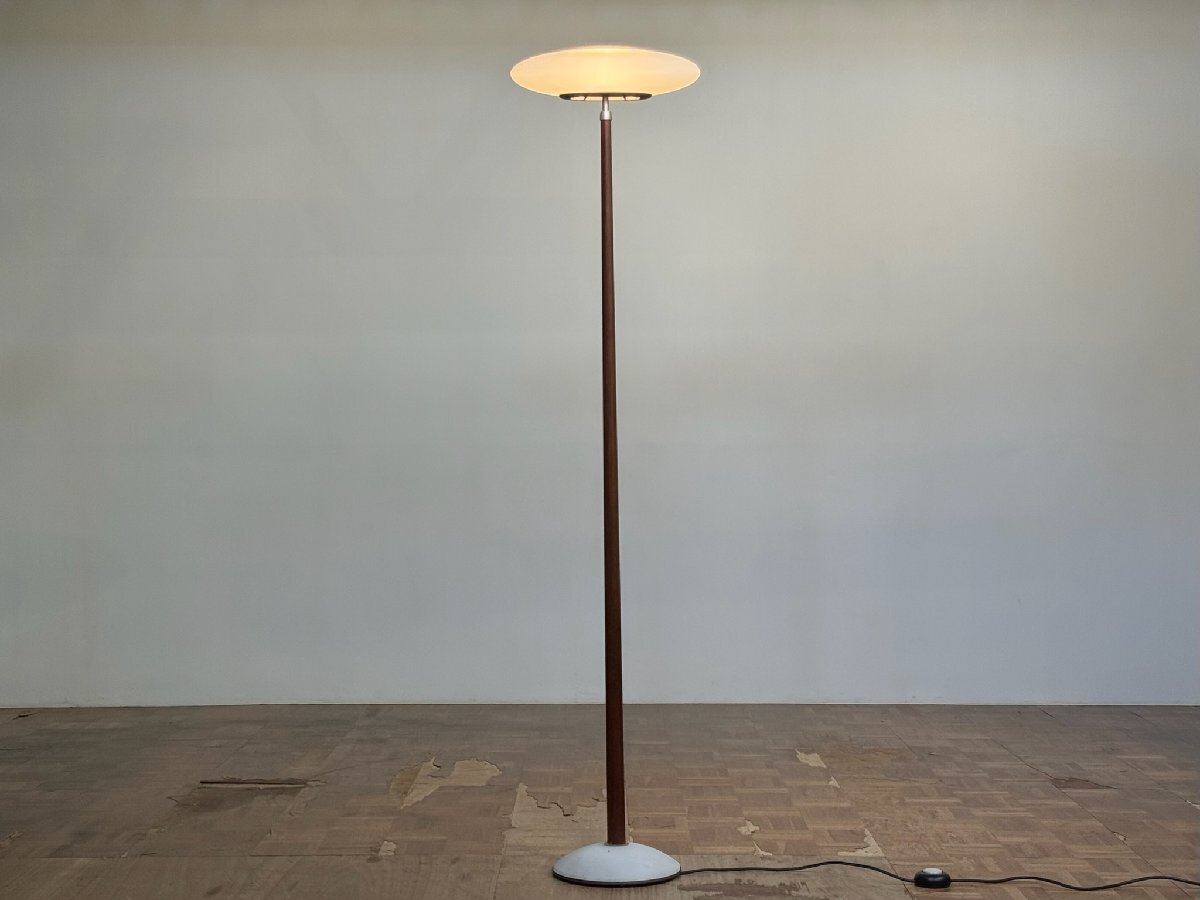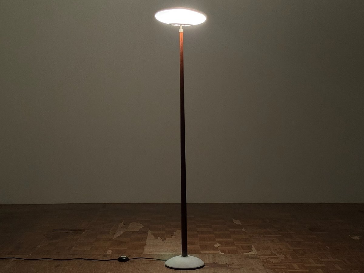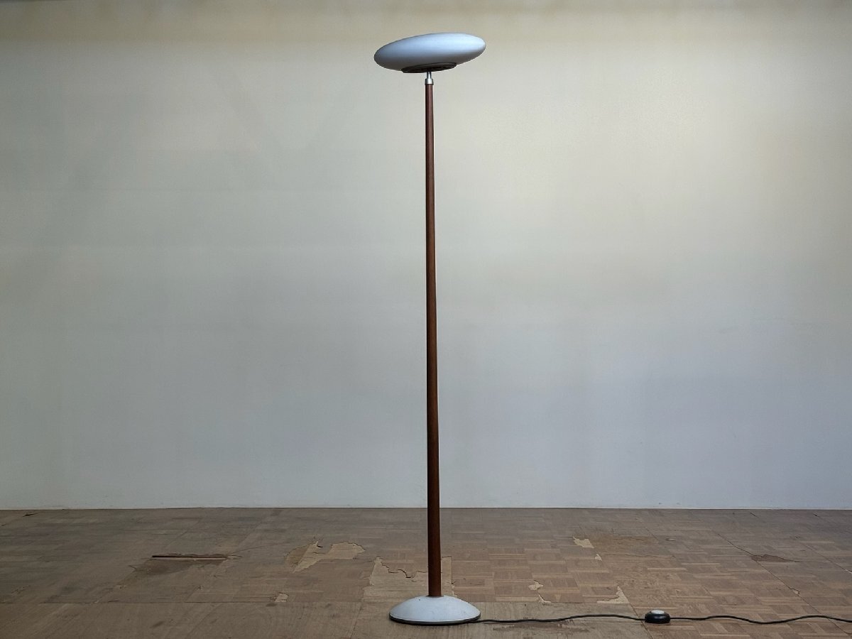 無垢のビーチ材をくり抜いた先端に向け細ばってゆくトラペーズシルエットにイタリアモダニズムとオーガニックな素材感を交差させる名手・Matteo Thun / マッテオ・トゥンらしい野心的なクラフツマンシップを宿しつつ、雲や繭のように見せるストイックな楕円シルエットの乳白色のガラスシェードでオーナメントや工芸品のような立ち姿にデザインされた1990sリリースの名作フロアスタンドライト。FLOS より。
