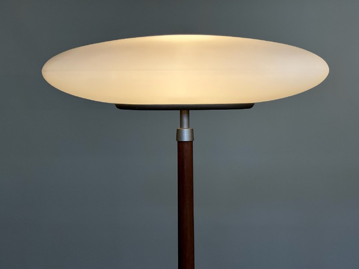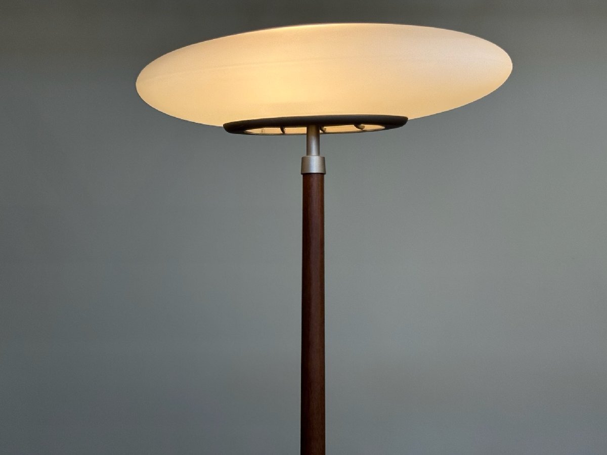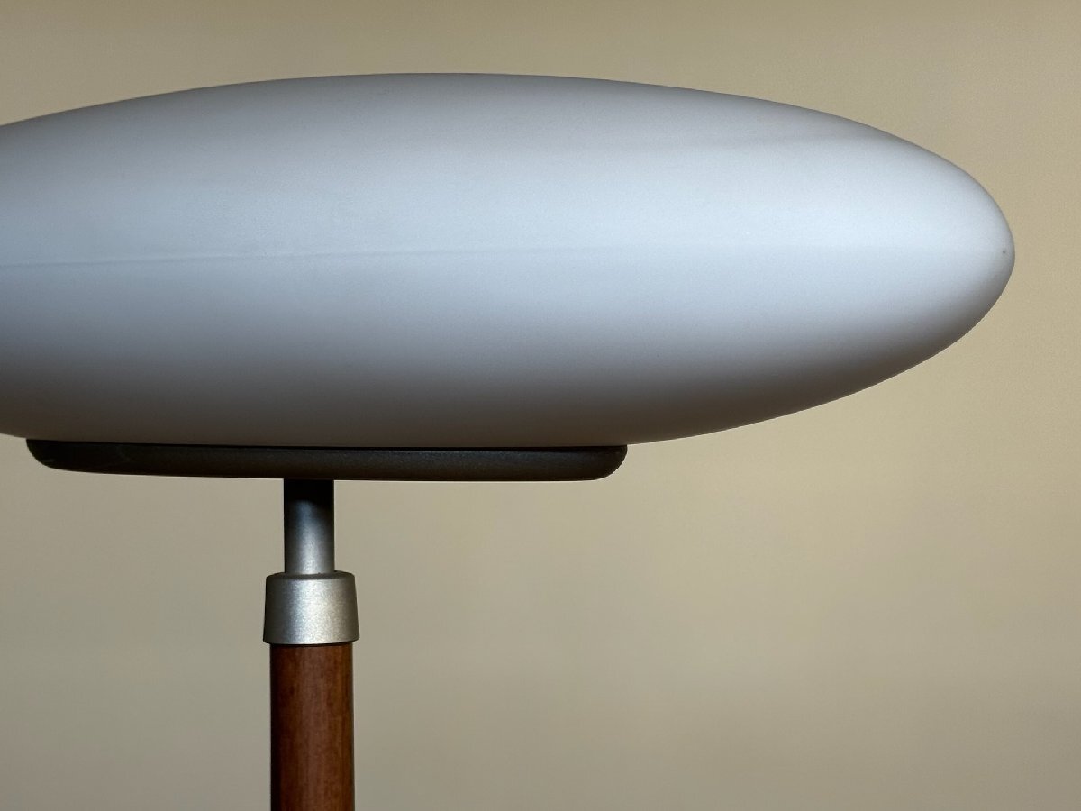 無垢のビーチ材をくり抜いた先端に向け細ばってゆくトラペーズシルエットにイタリアモダニズムとオーガニックな素材感を交差させる名手・Matteo Thun / マッテオ・トゥンらしい野心的なクラフツマンシップを宿しつつ、雲や繭のように見せるストイックな楕円シルエットの乳白色のガラスシェードでオーナメントや工芸品のような立ち姿にデザインされた1990sリリースの名作フロアスタンドライト。FLOS より。
